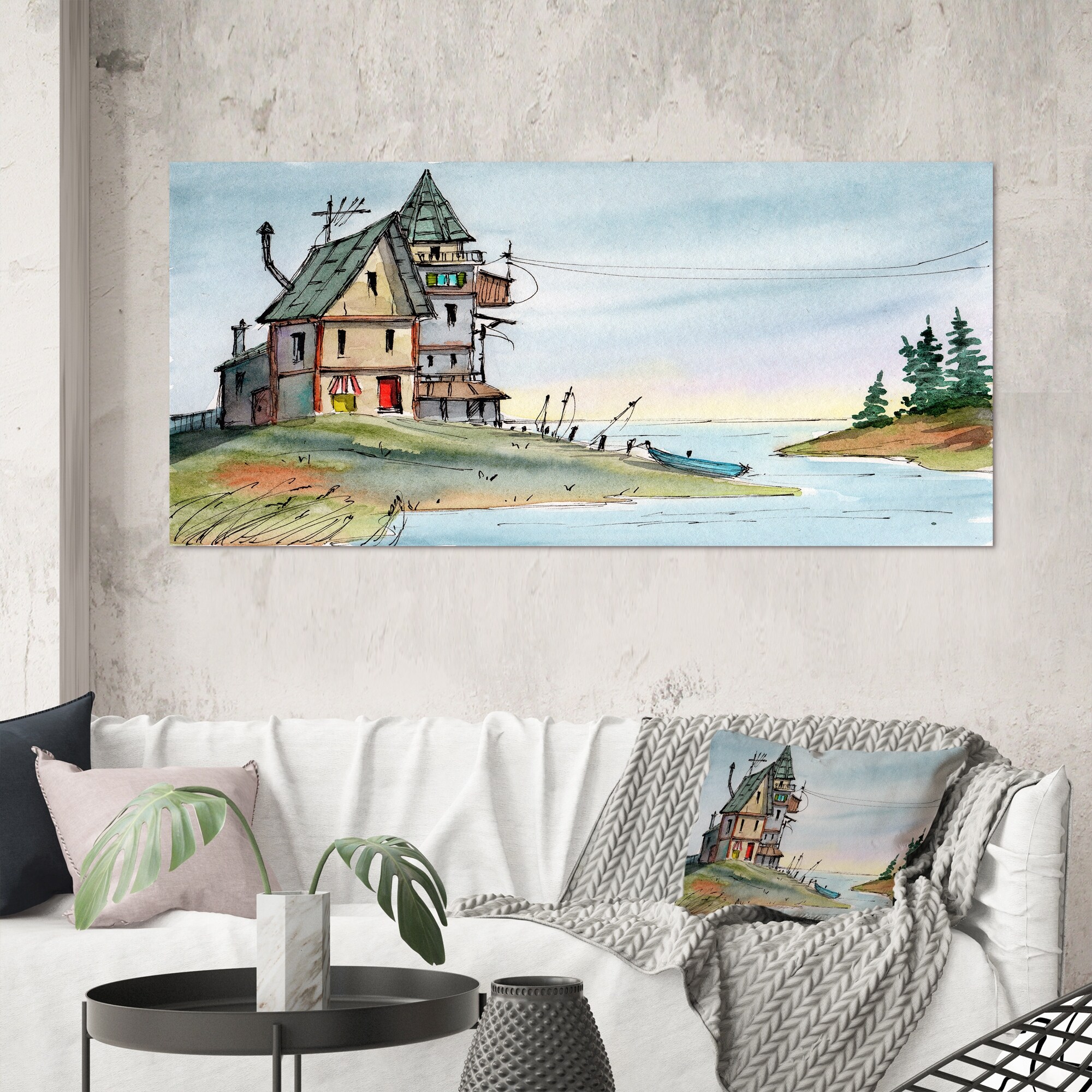 Designart "Colorful Old House With A Tower By the Riverside" Nautical & Coastal Canvas Wall Art Print