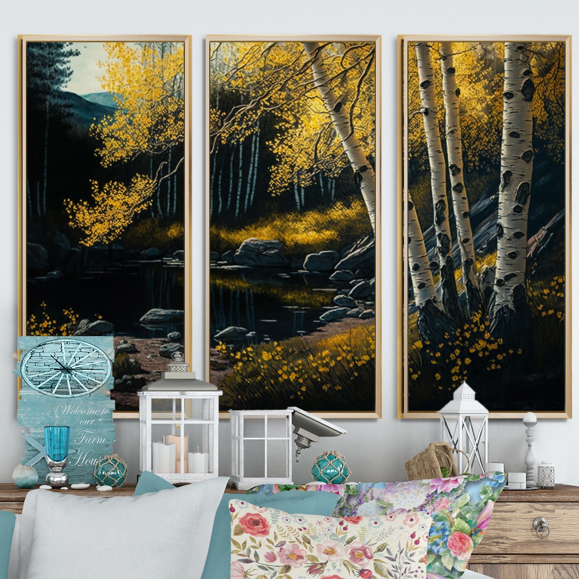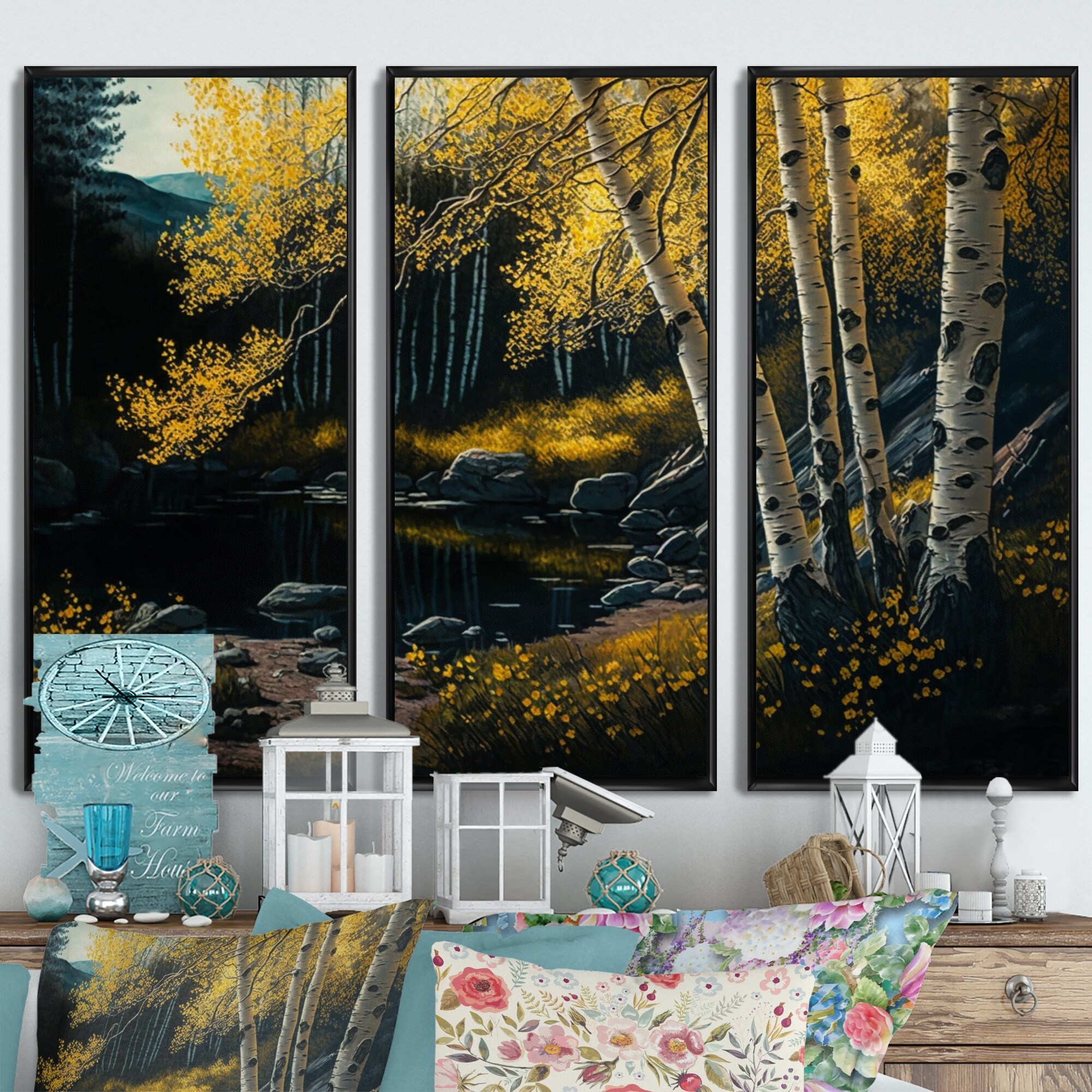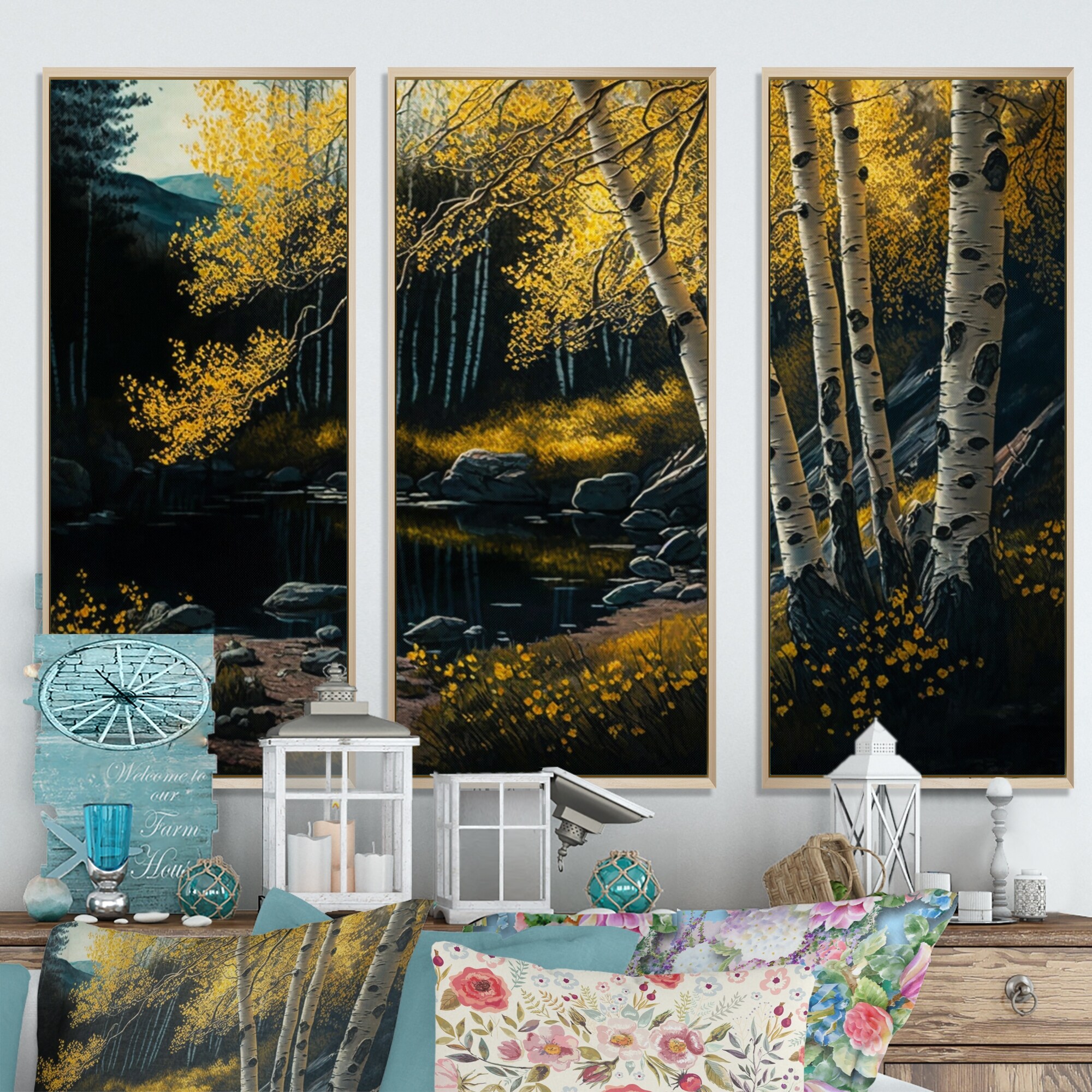 Designart "Yellow Birches By the Riverside I" Landscape Forest Framed Canvas Wall Art Print - 3 Panels