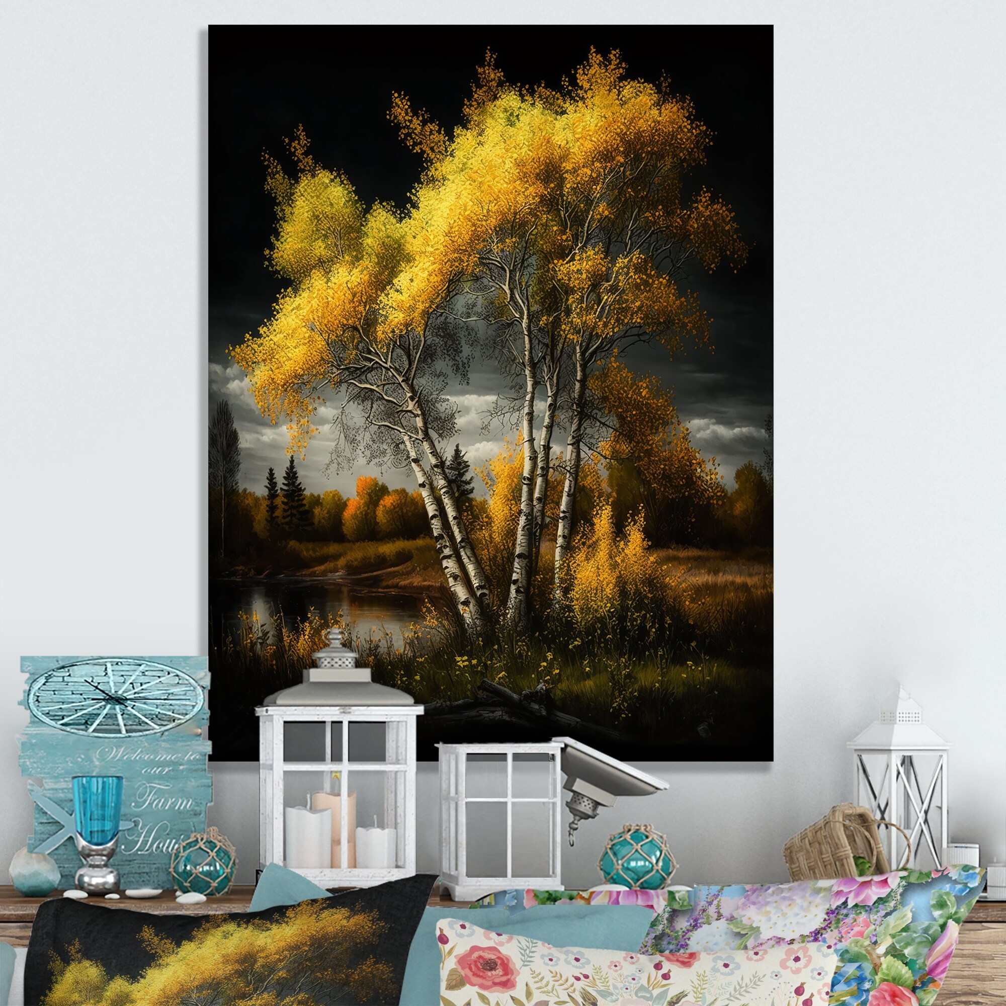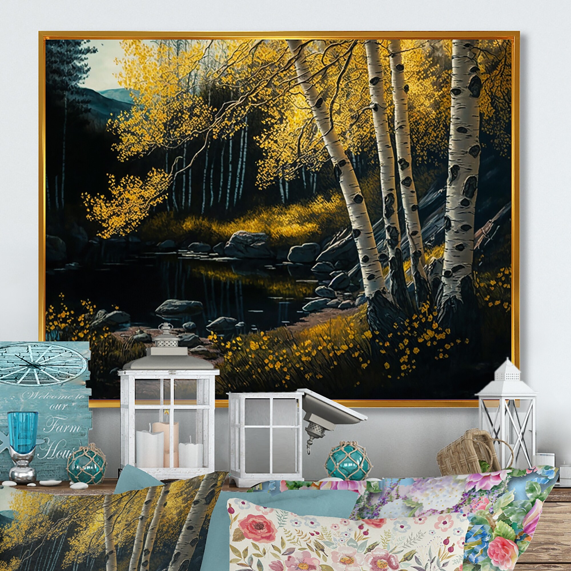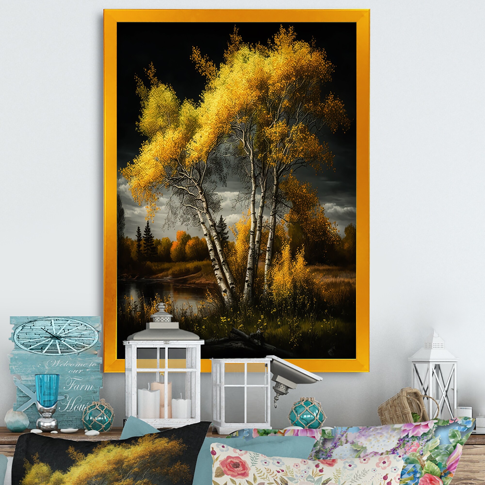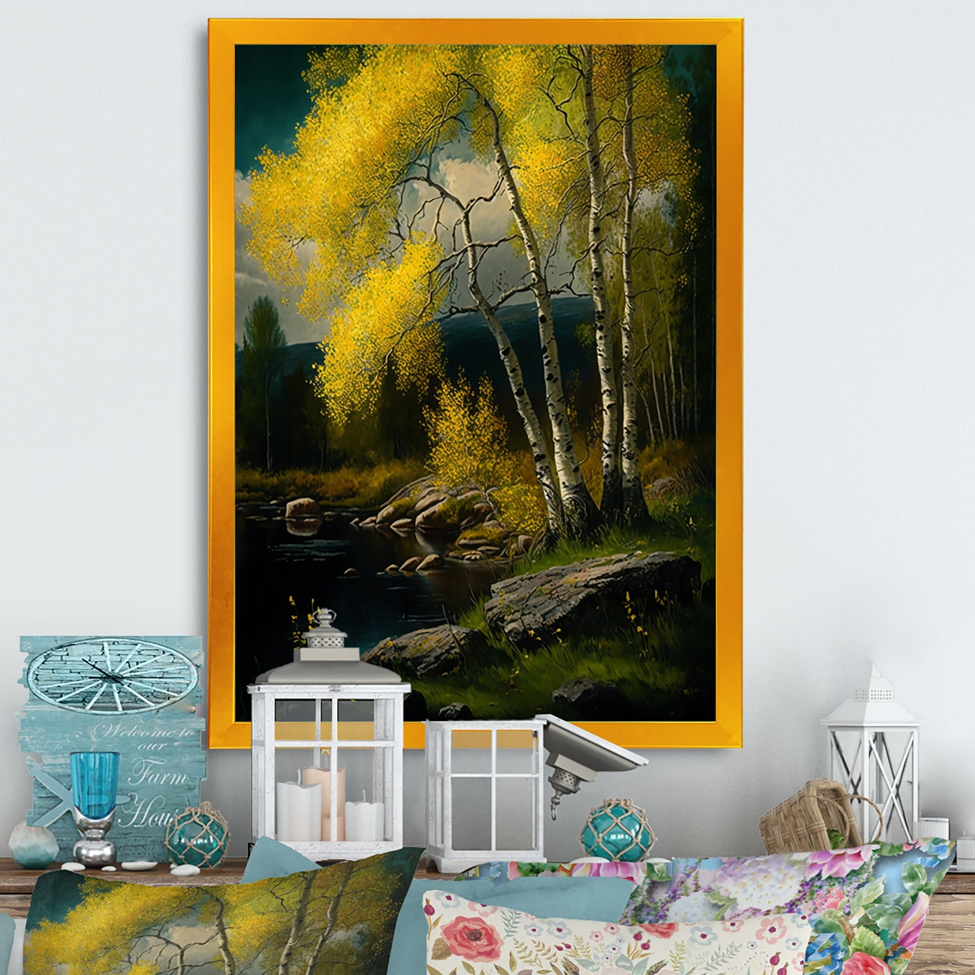 Designart "Yellow Birches By the Riverside I" Landscape Forest Framed Canvas Wall Art Print