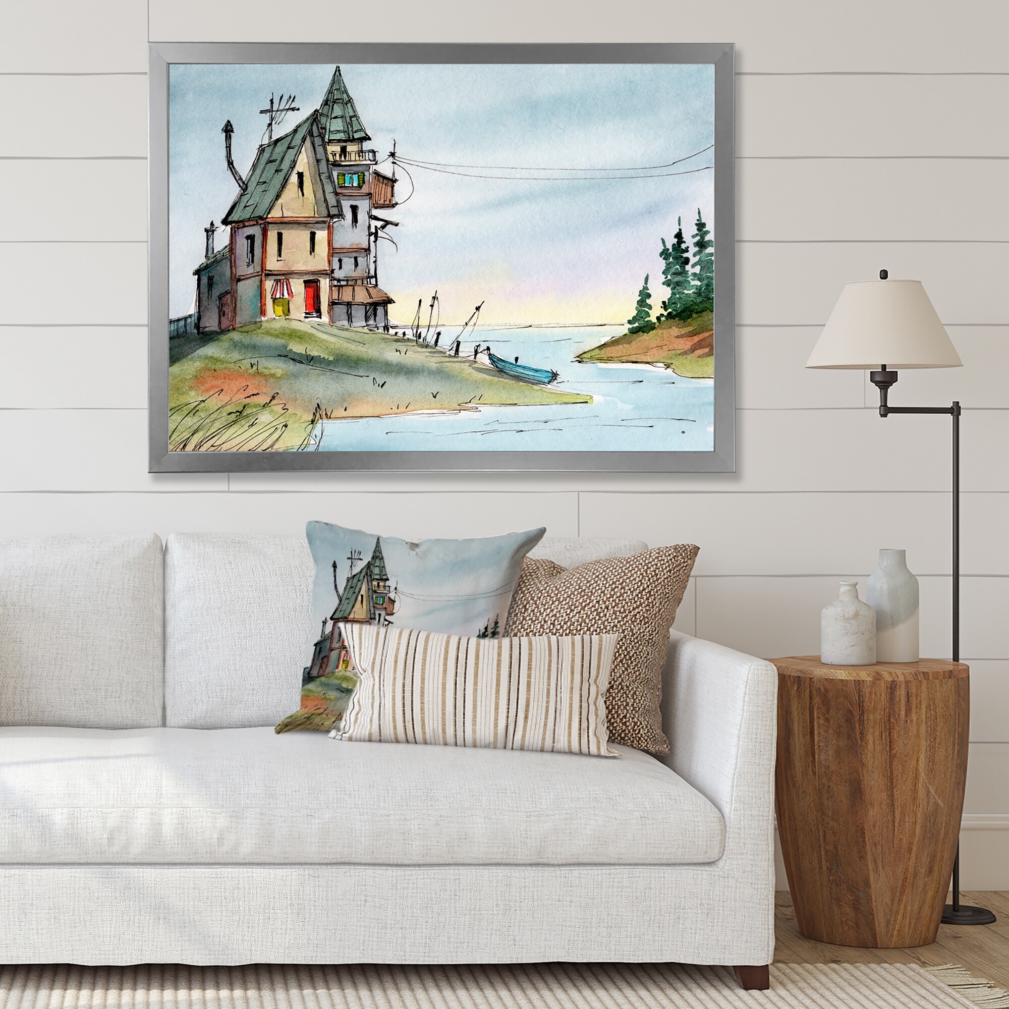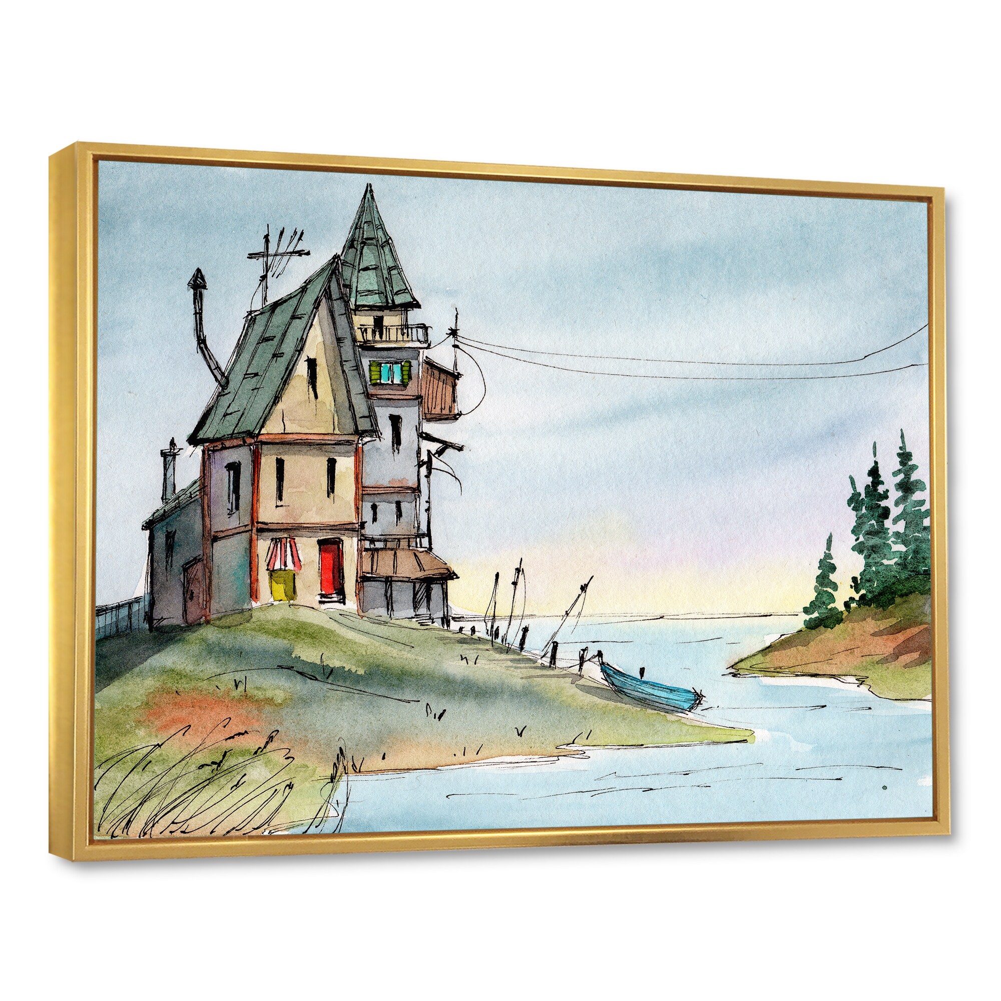 Designart "Colorful Old House With A Tower By the Riverside" Nautical & Coastal Framed Art Print