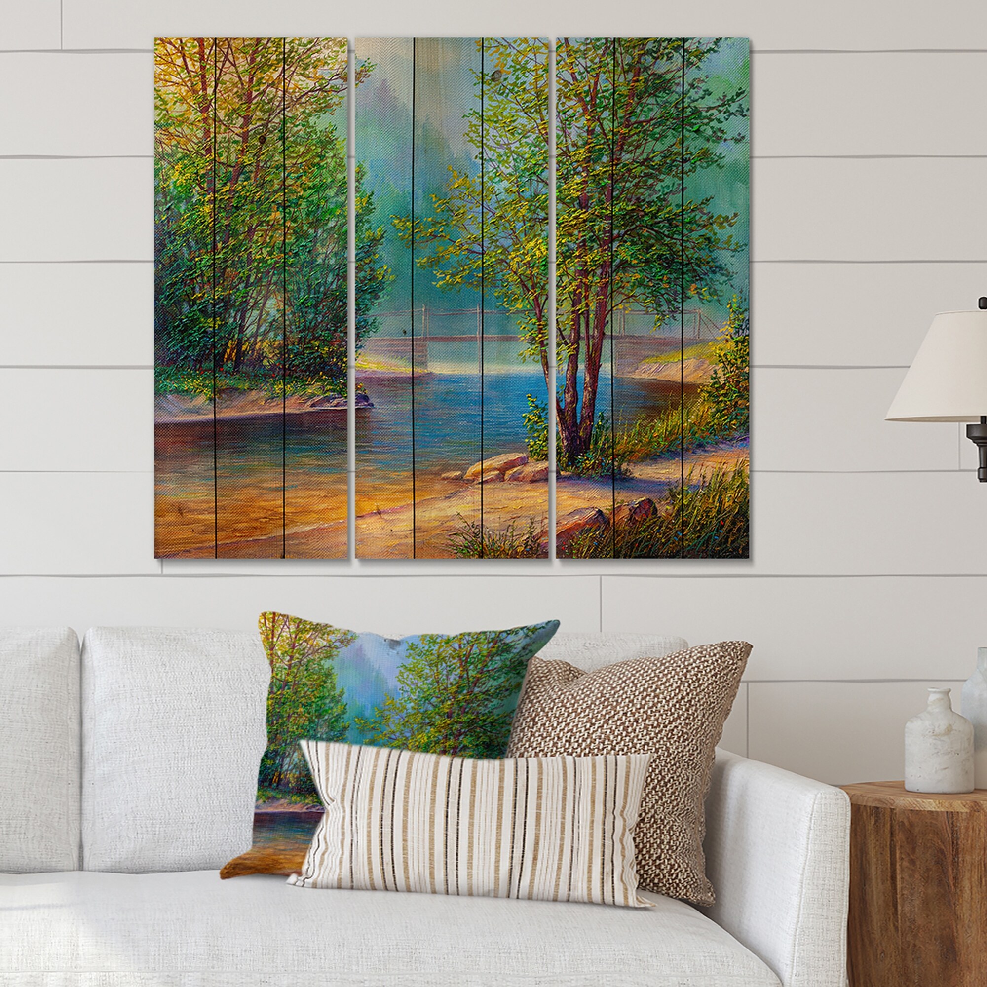 Designart 'Green Trees By the Riverside' Traditional Print on Natural Pine Wood - 3 Panels
