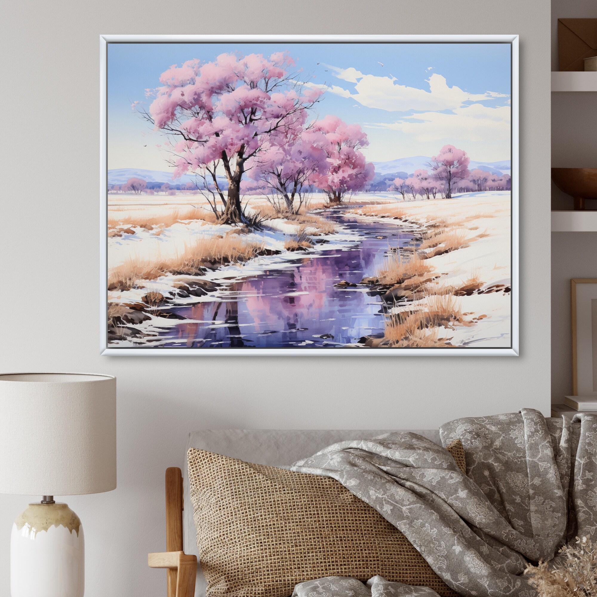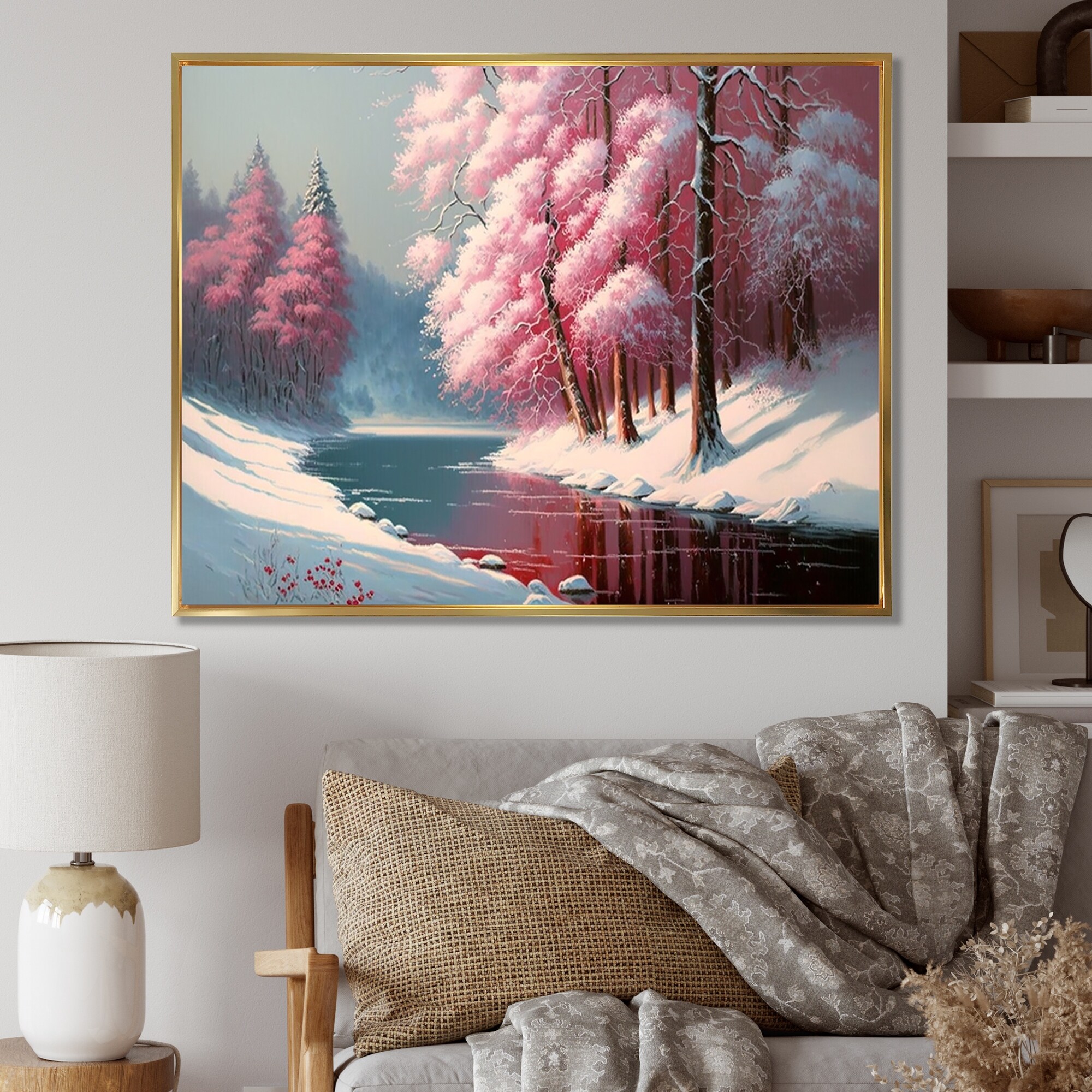 Designart "Pink Winter Trees By the Riverside" Landscape Lake River Framed Wall Art Living Room