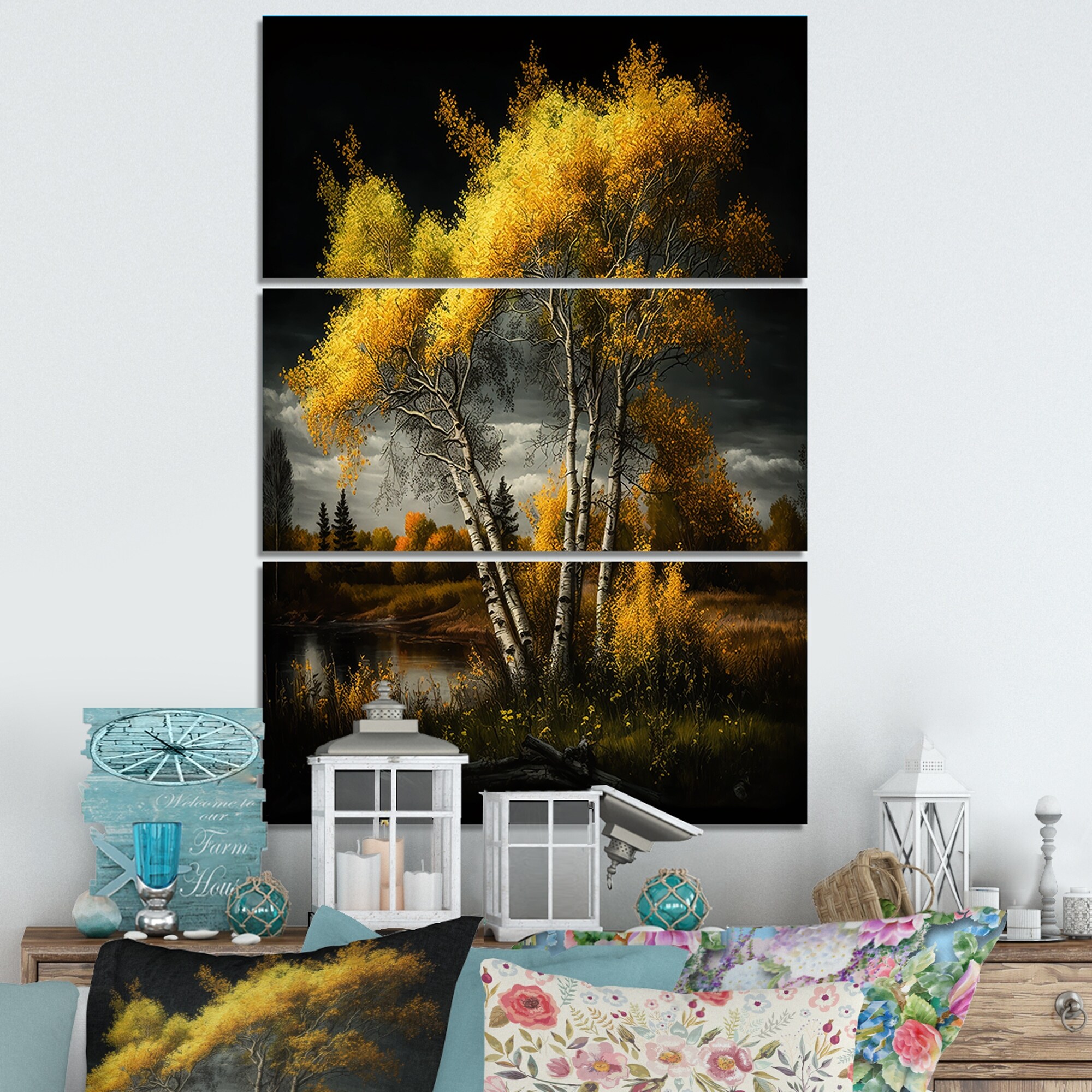 Designart "Yellow Birches By the Riverside II" Landscape Forest Canvas Art Print - 3 Panels