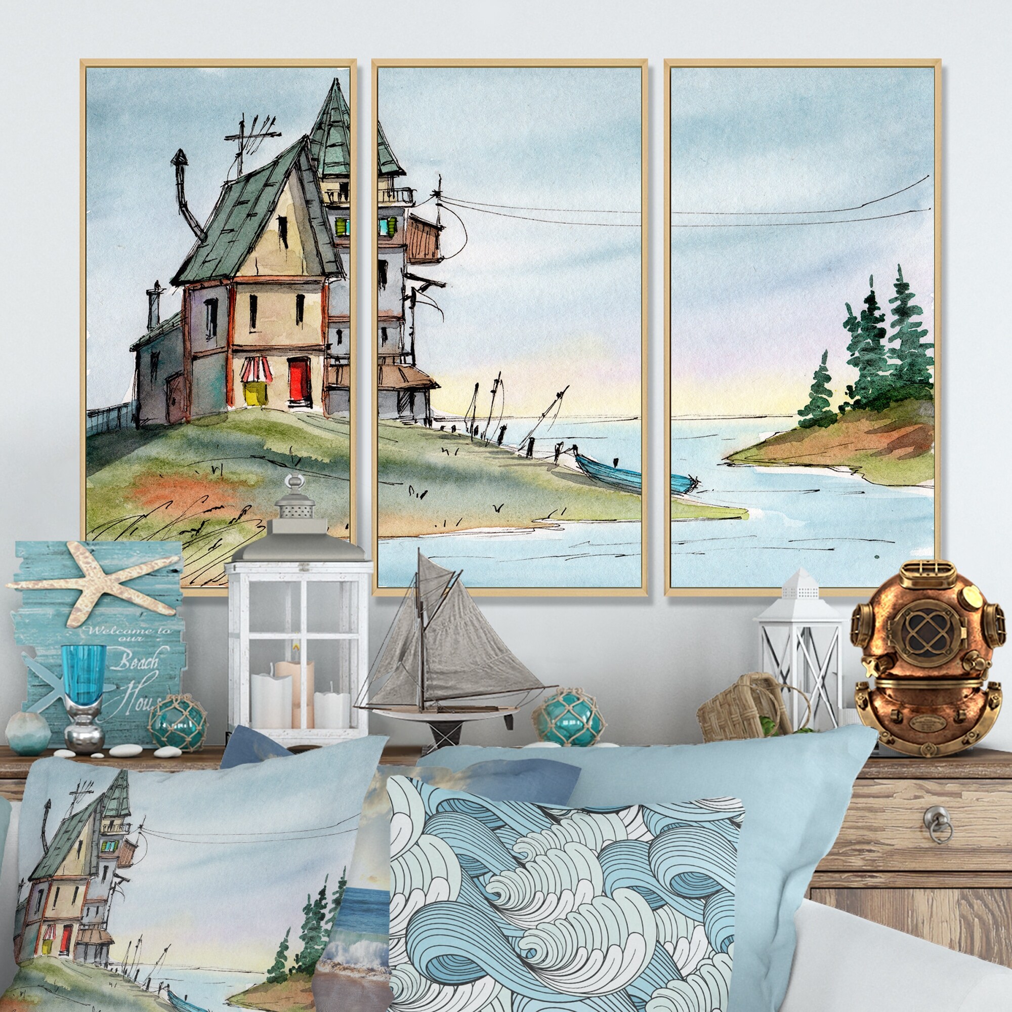 Designart "Colorful Old House With A Tower By the Riverside" Nautical & Coastal Framed Canvas Wall Art Print - 3 Panels