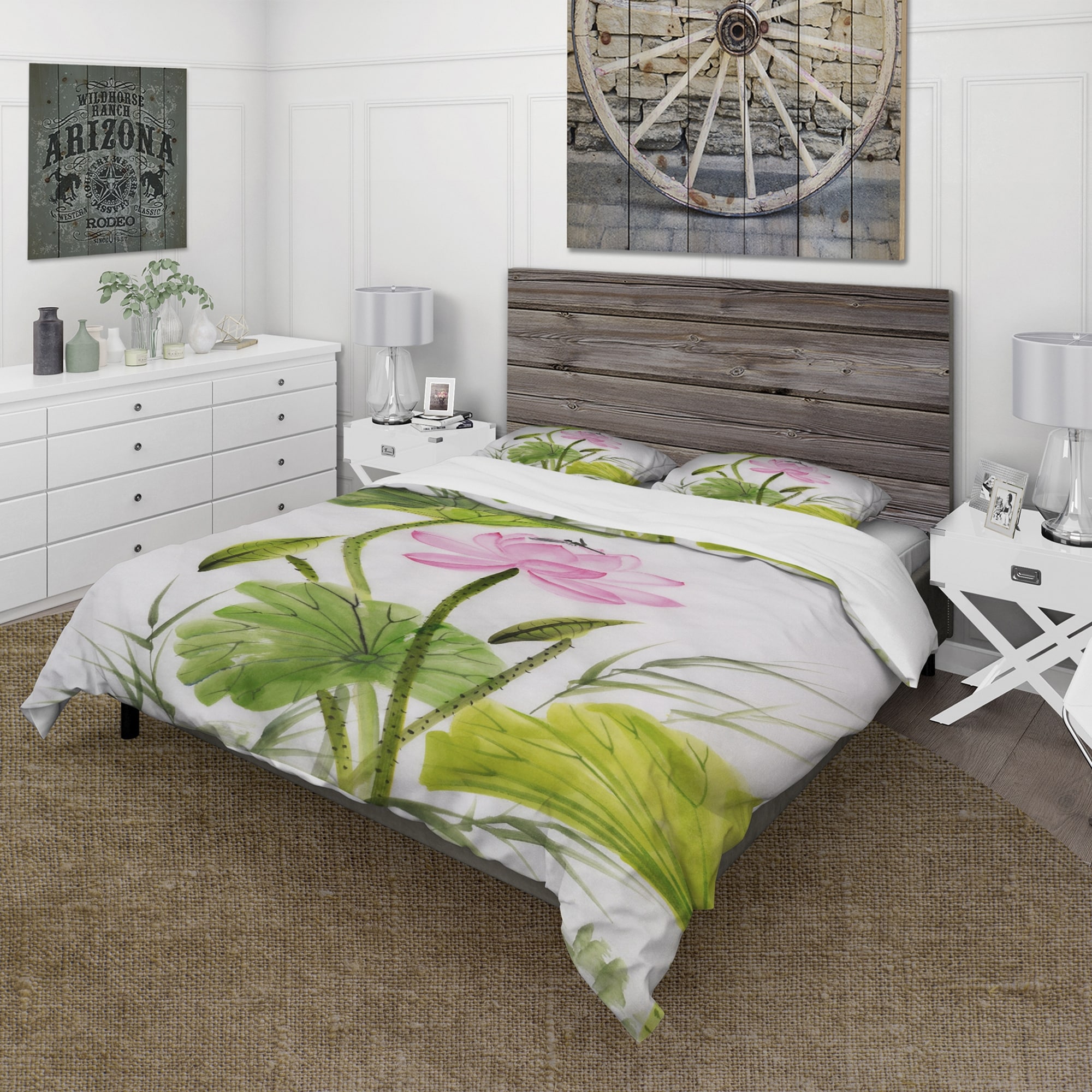 Designart 'Single Vintage Lotus Flower With Green Leaves' Traditional Duvet Cover Set