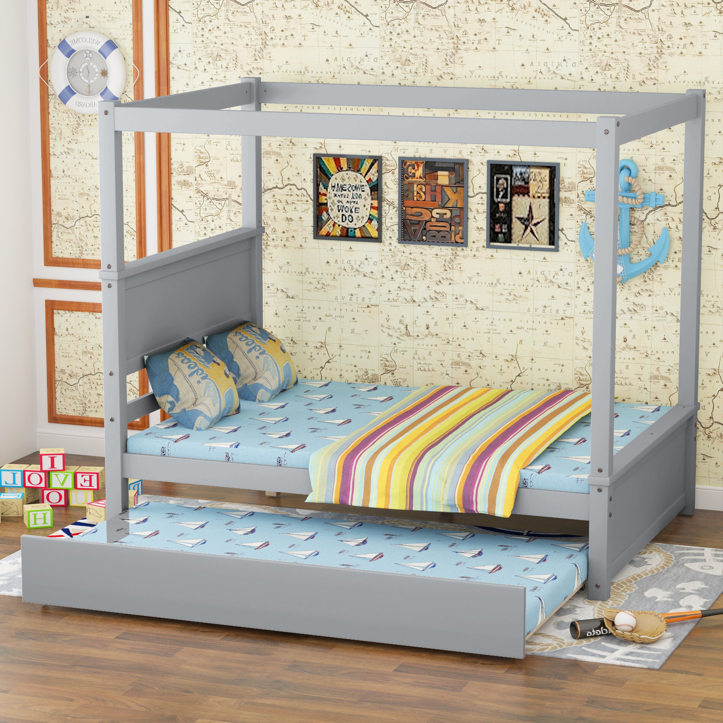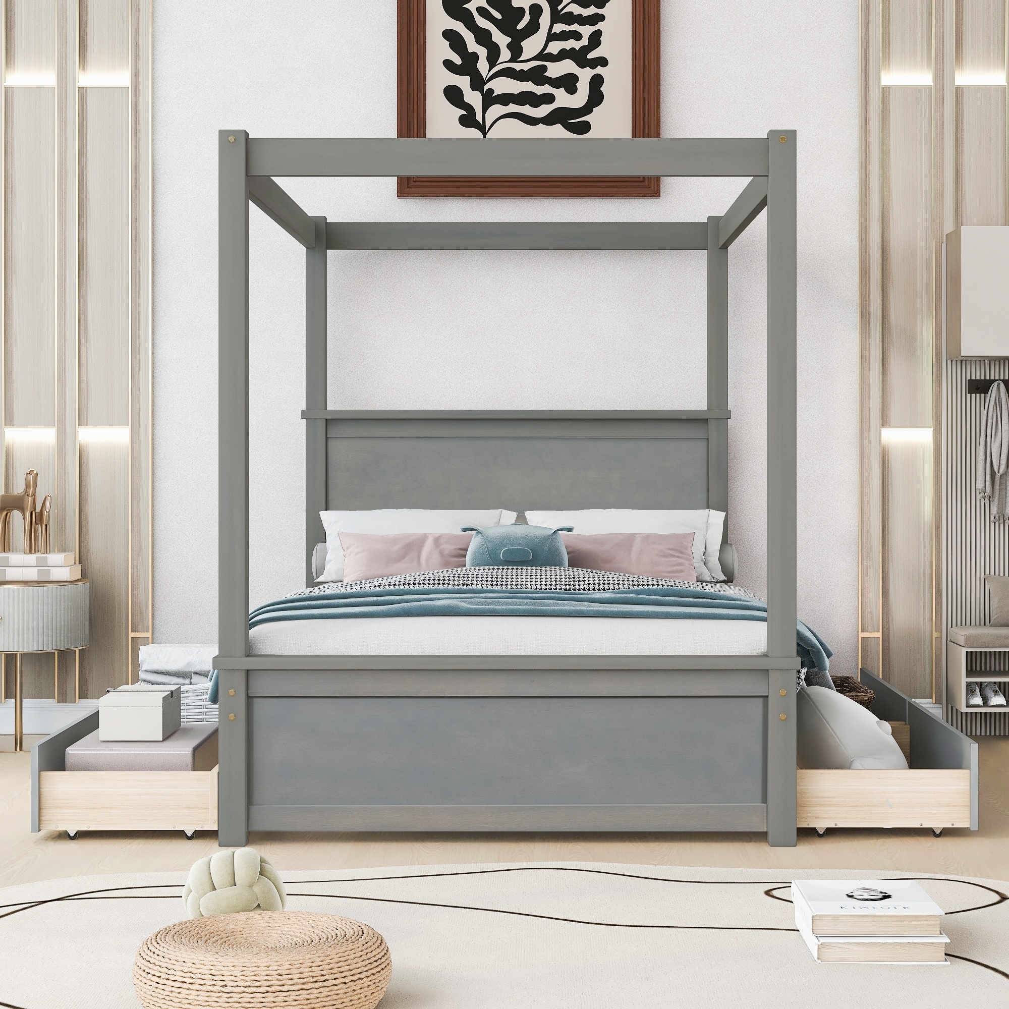 Wood Canopy Bed Full Size Platform Bed with Trundle Bed & Slat Support