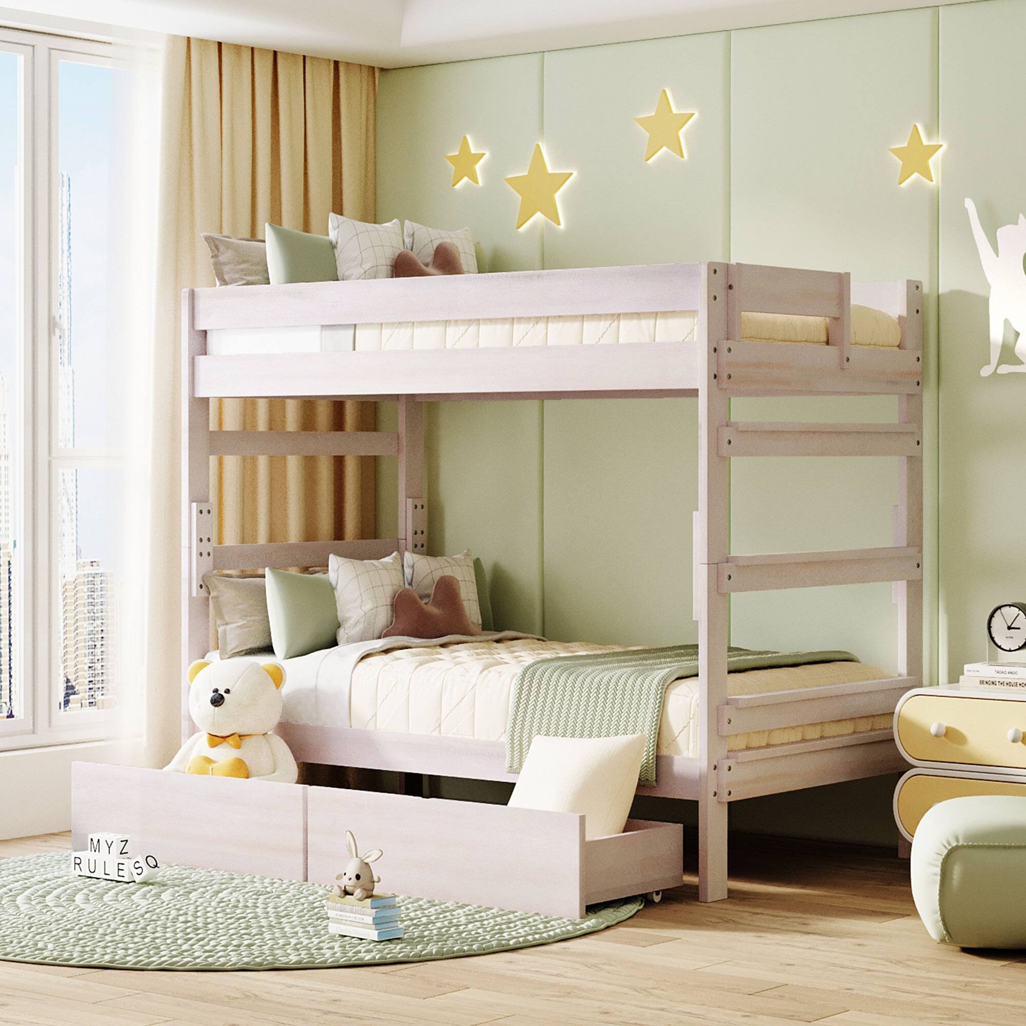 Twin over Twin Size Solid Wood Bunk Bed with 2 Storage Drawers, Full-Length Guardrail and Wood Slats