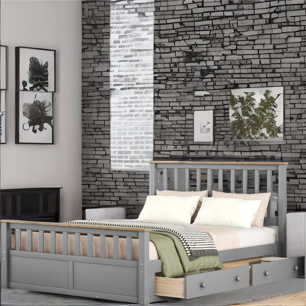 Wood Platform Bed with Two Drawers and Wooden Slat Support