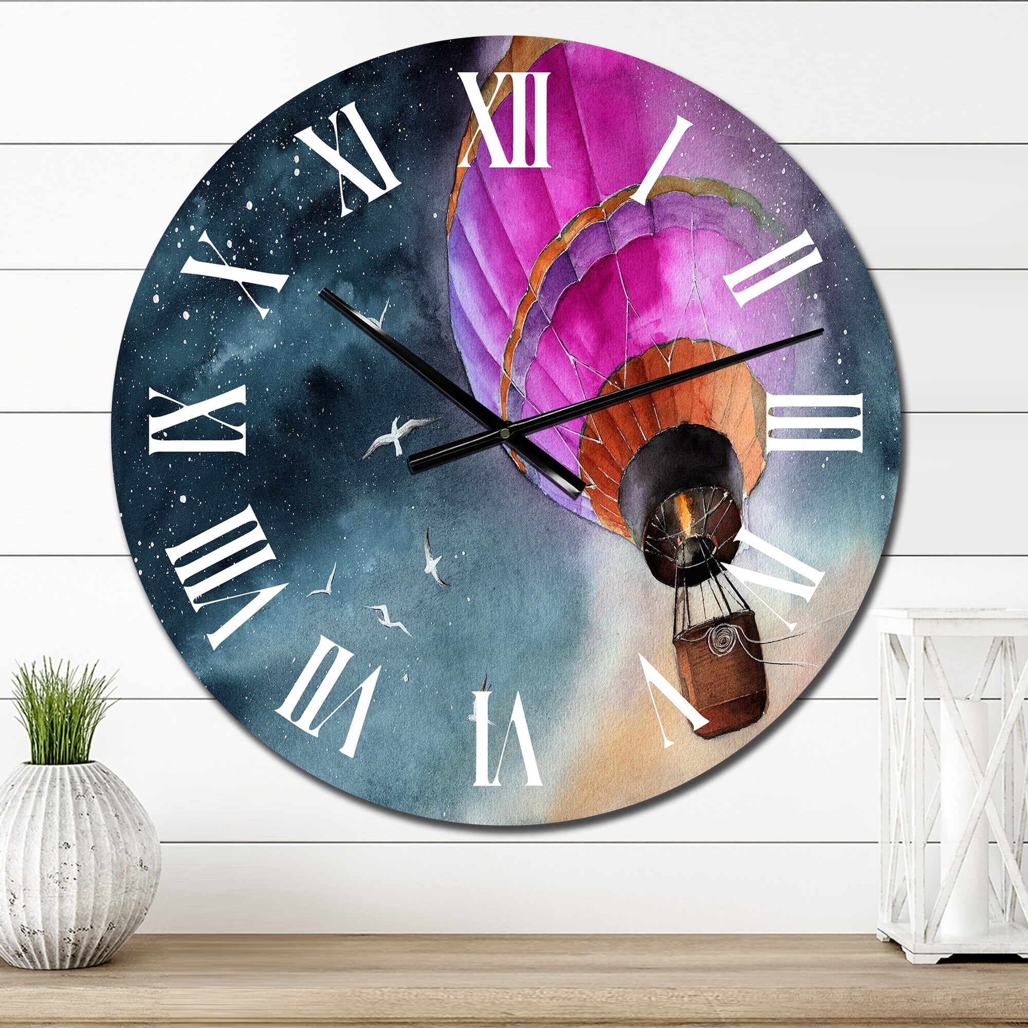 Designart 'Pink Air Balloon in Starry Night' Country wall clock