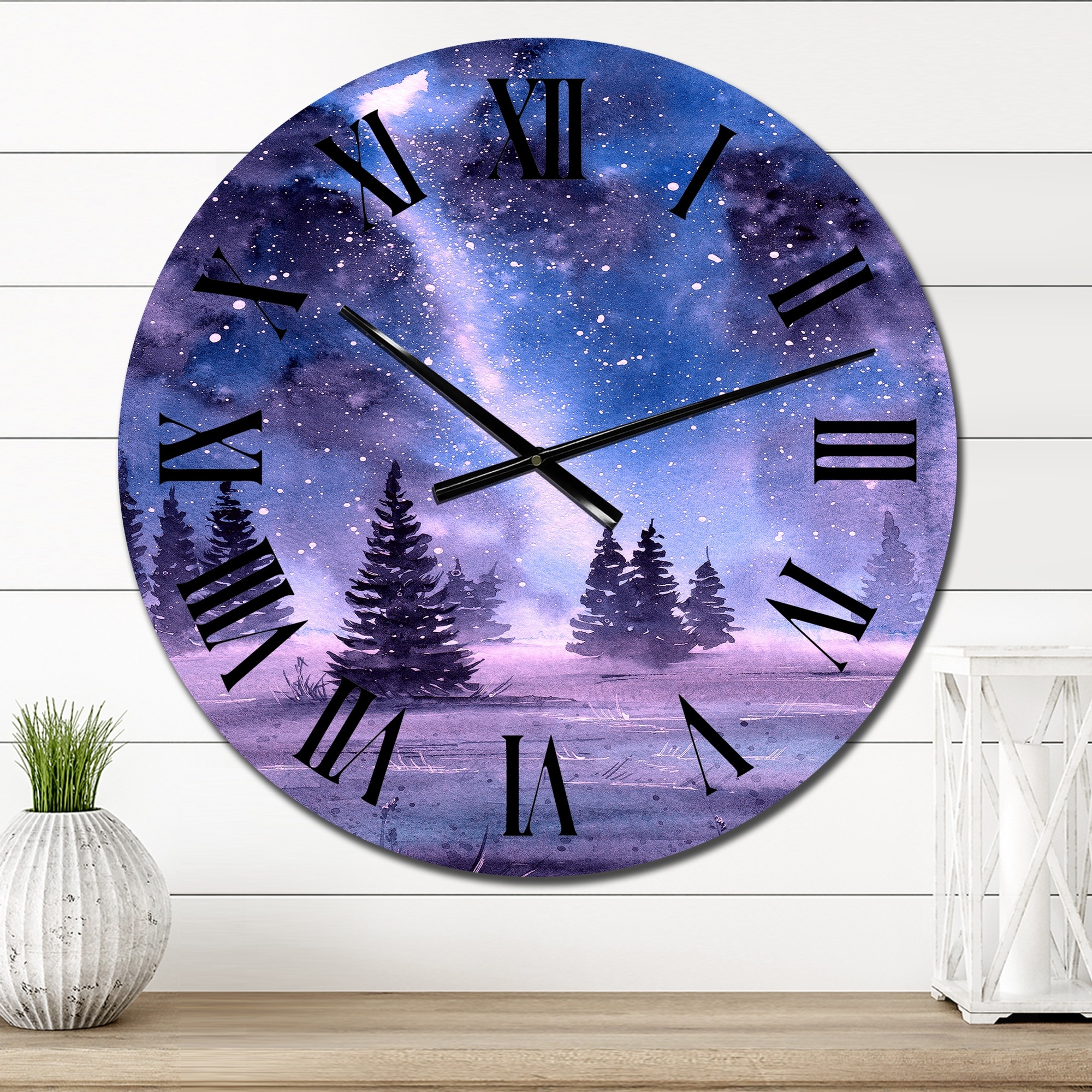 Designart 'Starry Night Landscape With Fir Trees' Traditional wall clock