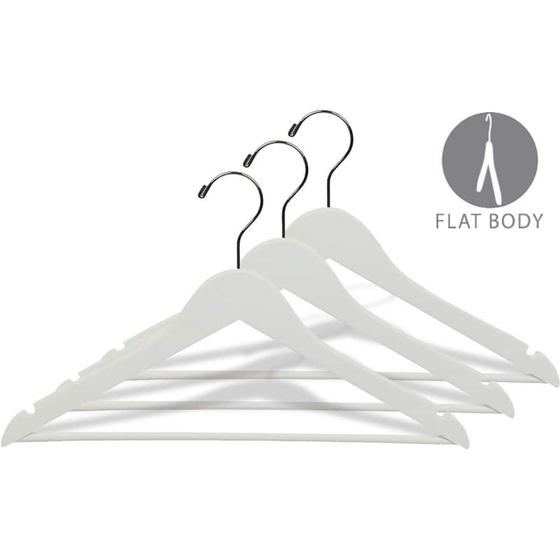 White Rubberized Wooden Suit Hanger with Solid Wood Bar, Flat 17 Inch Rubber Coated Hangers with Chrome Swivel Hook & Notches
