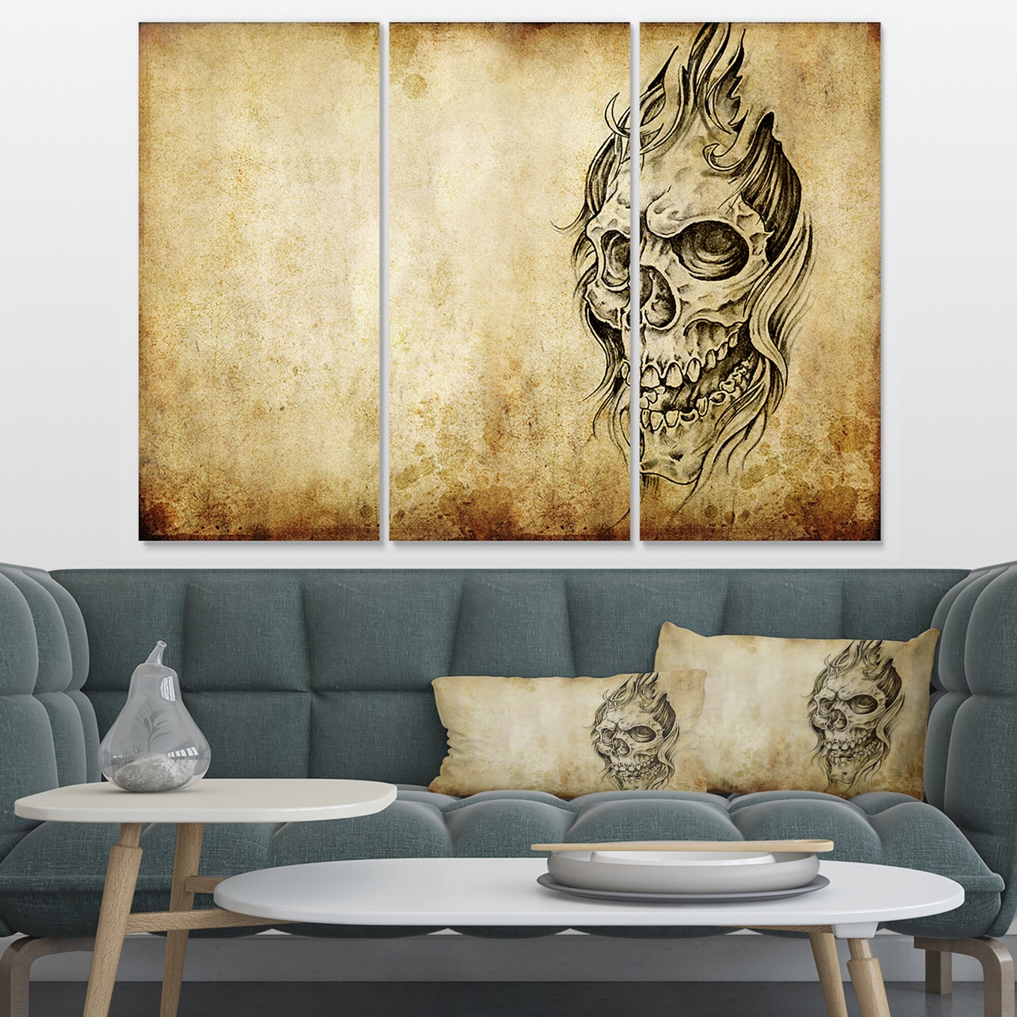 Designart "Death Tattoo Art" Abstract Portrait Canvas Print - 36x28 - 3 Panels