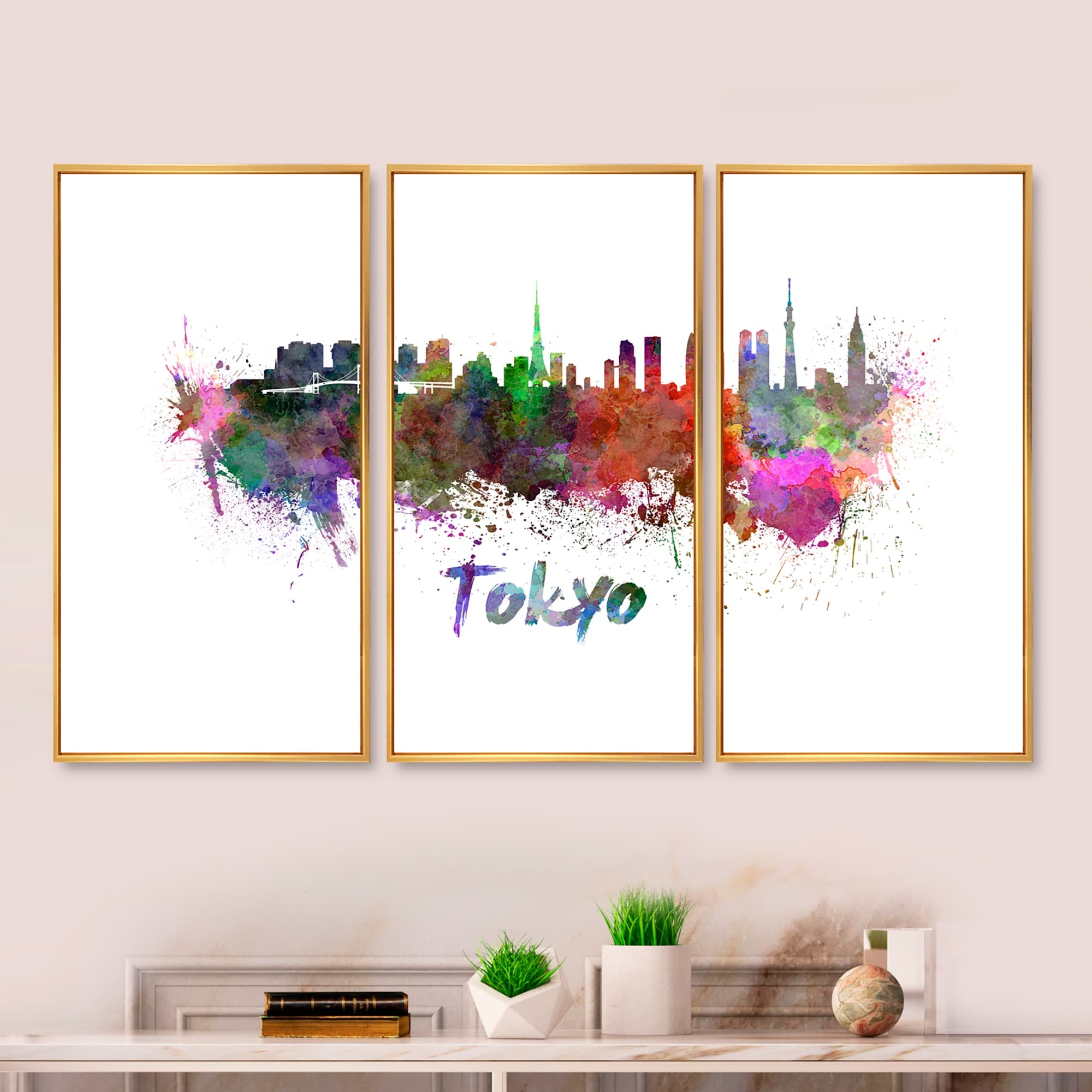 Designart "Tokyo Skyline" Cityscape Framed Canvas Wall Art Set of 3 - 4 Colors of Frames