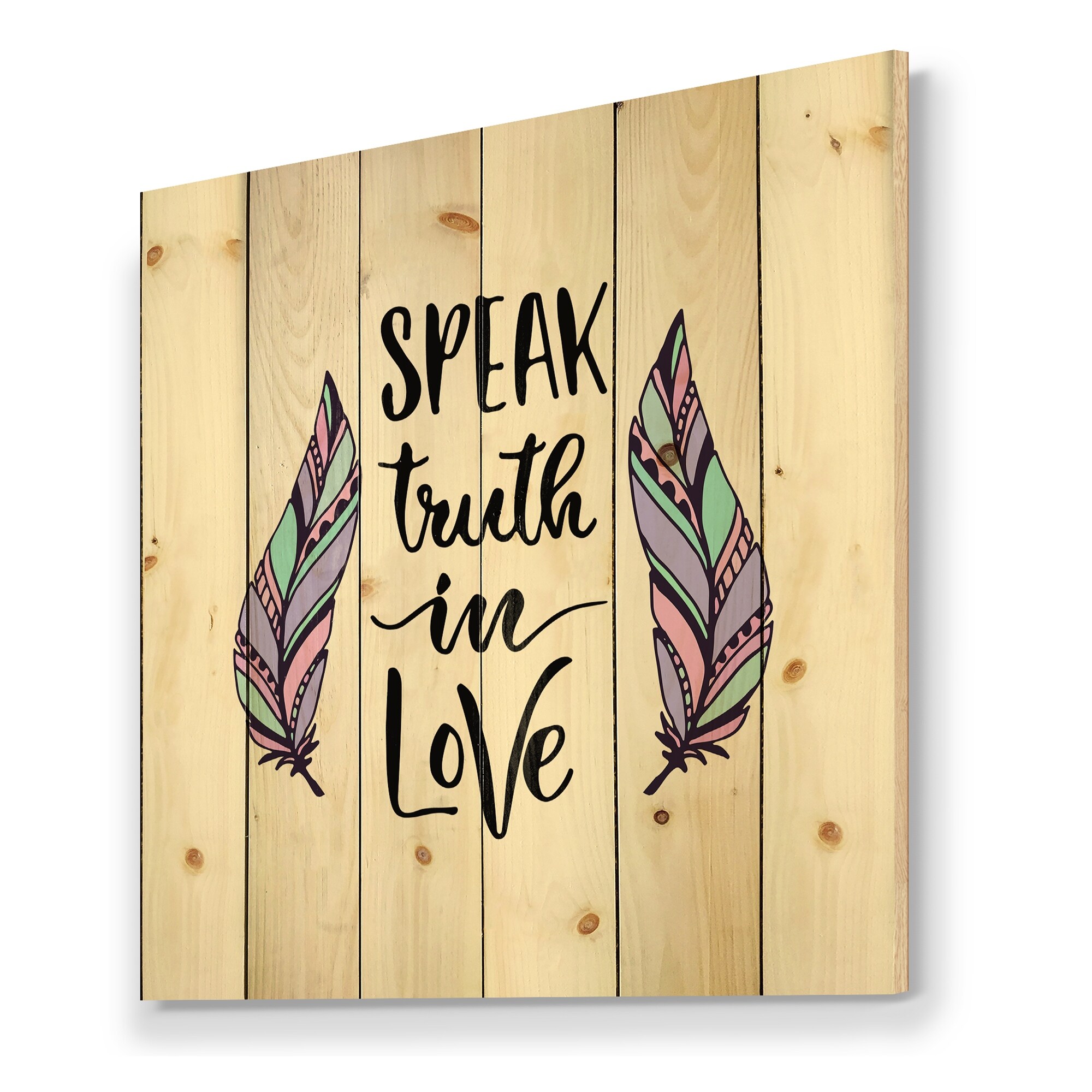 Designart 'Spreak Truth in Love Tribal Feathers I' Modern Print on Natural Pine Wood