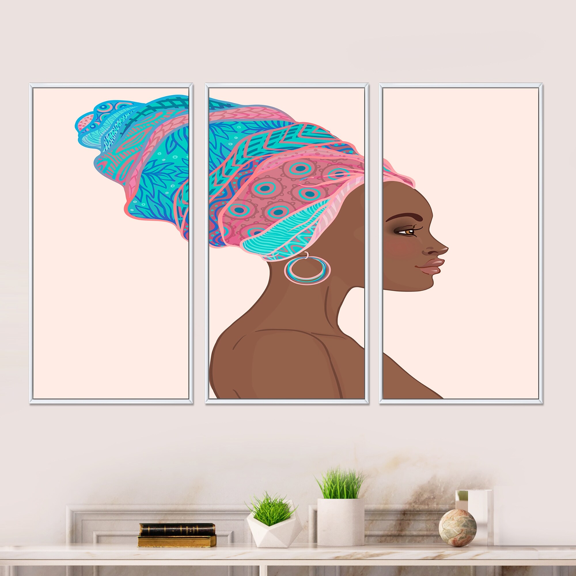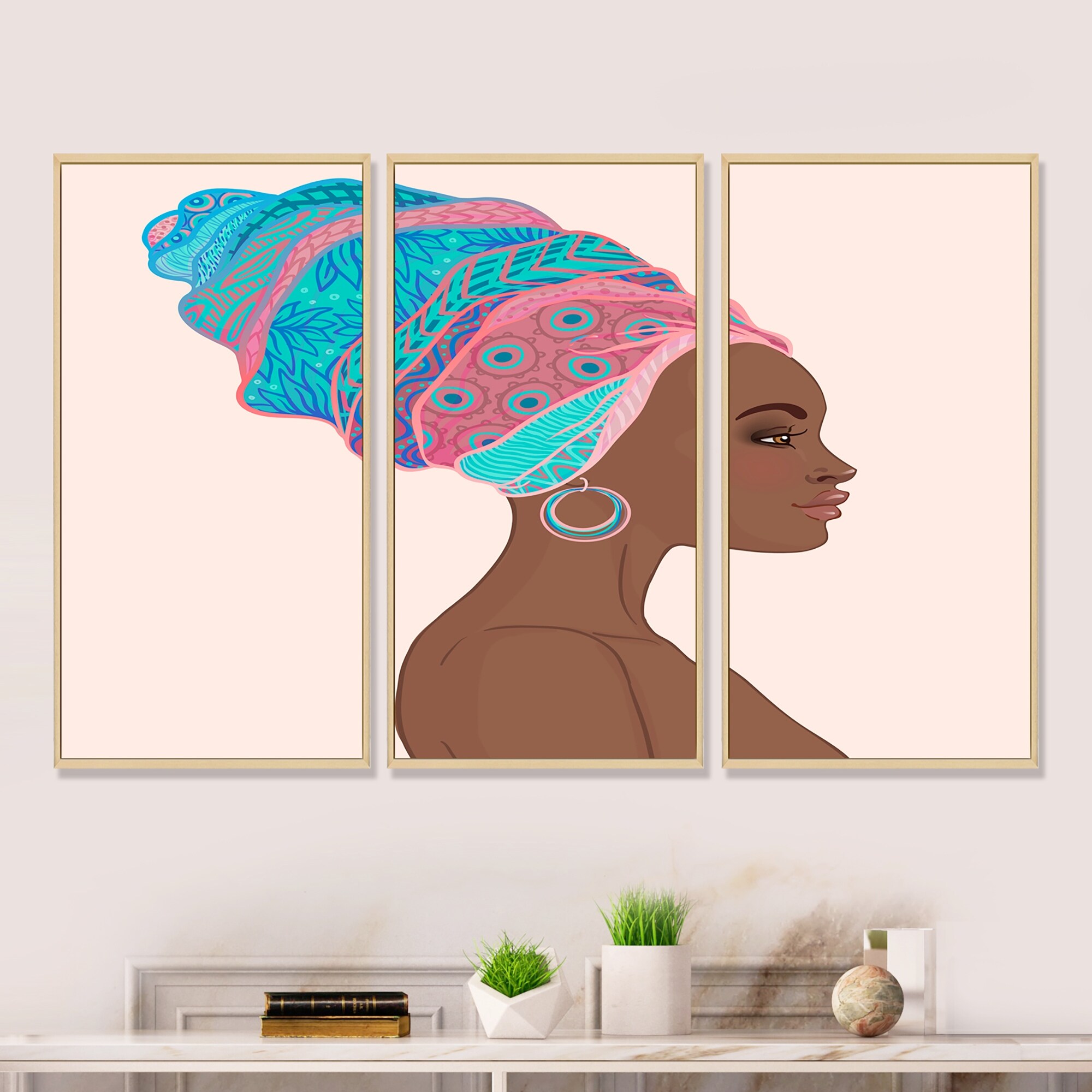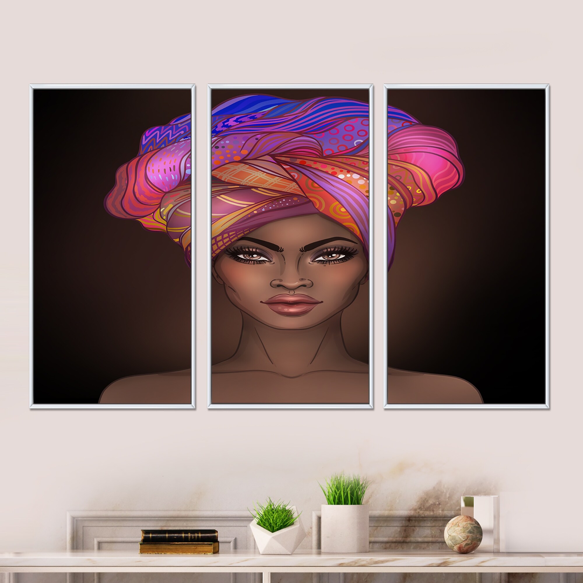 Designart "African American Woman with Turban VI" Modern Framed Canvas Wall Art Set of 3 - 4 Colors of Frames