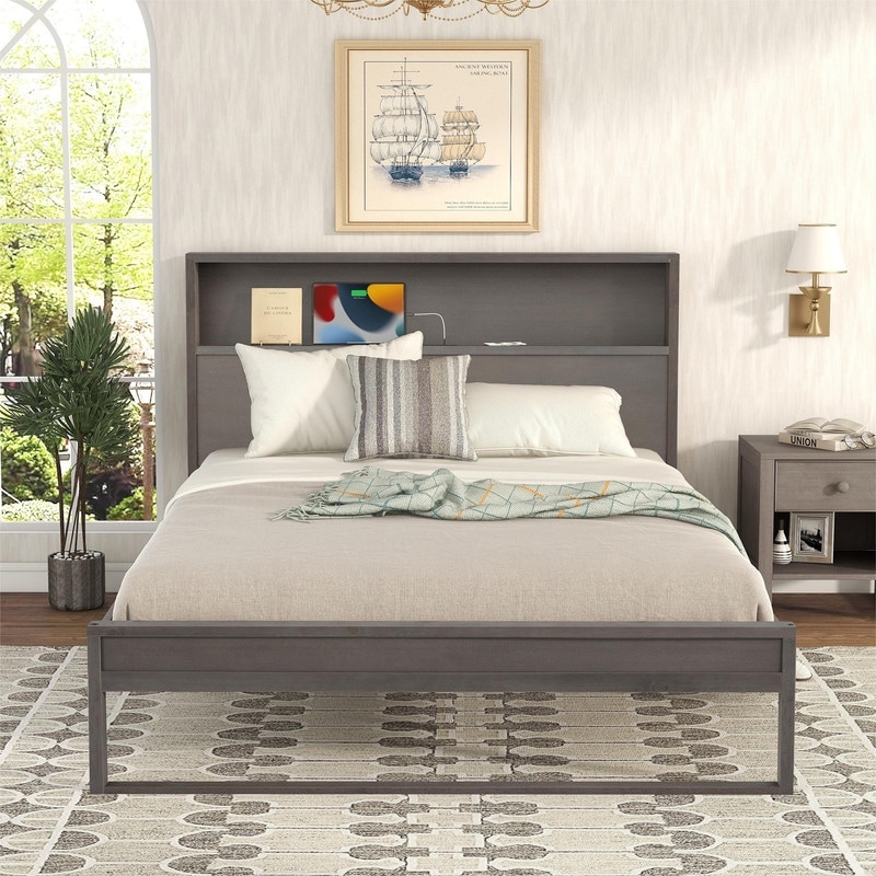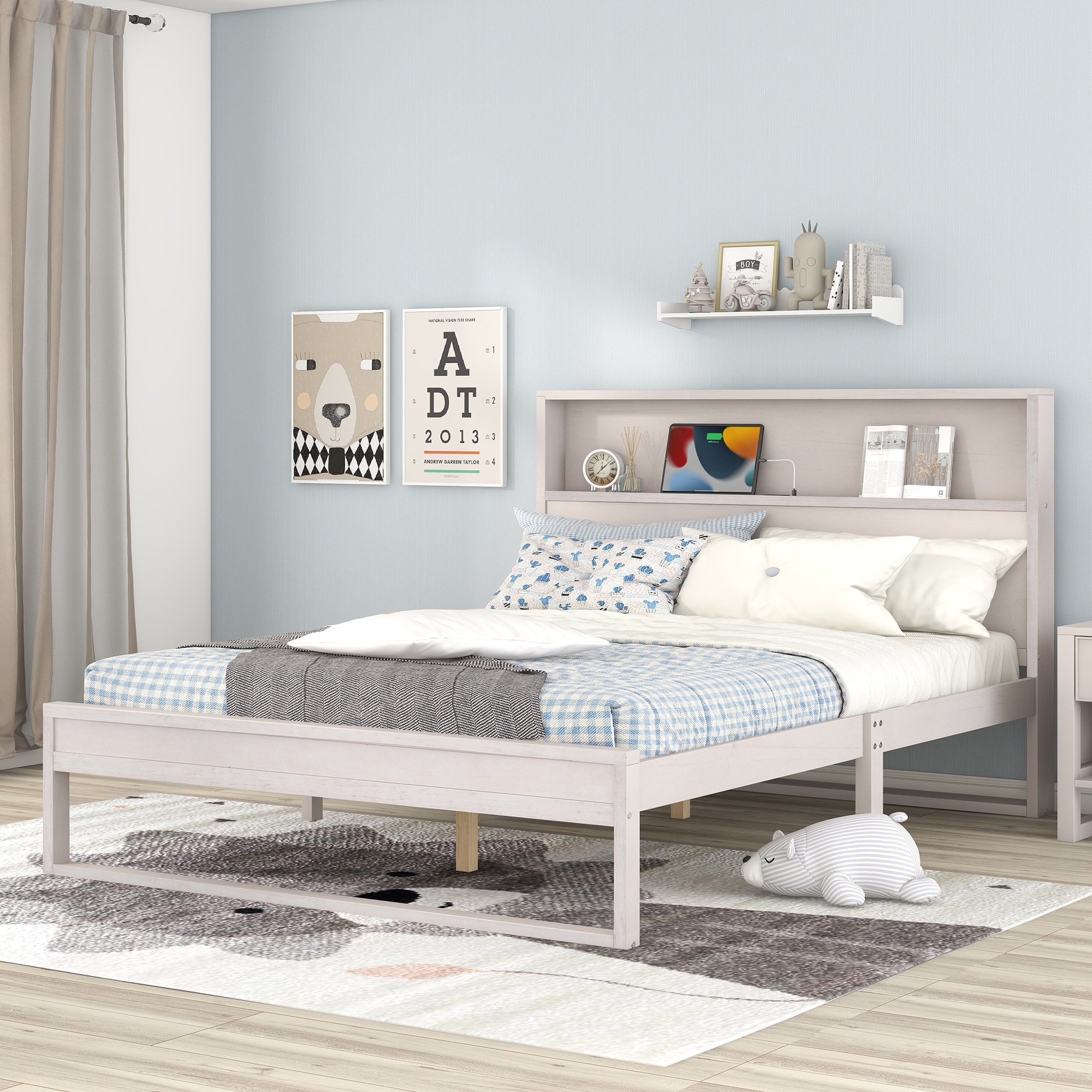 Full Size Wood Platform Bed with Storage Headboard, Sockets and Usb Ports