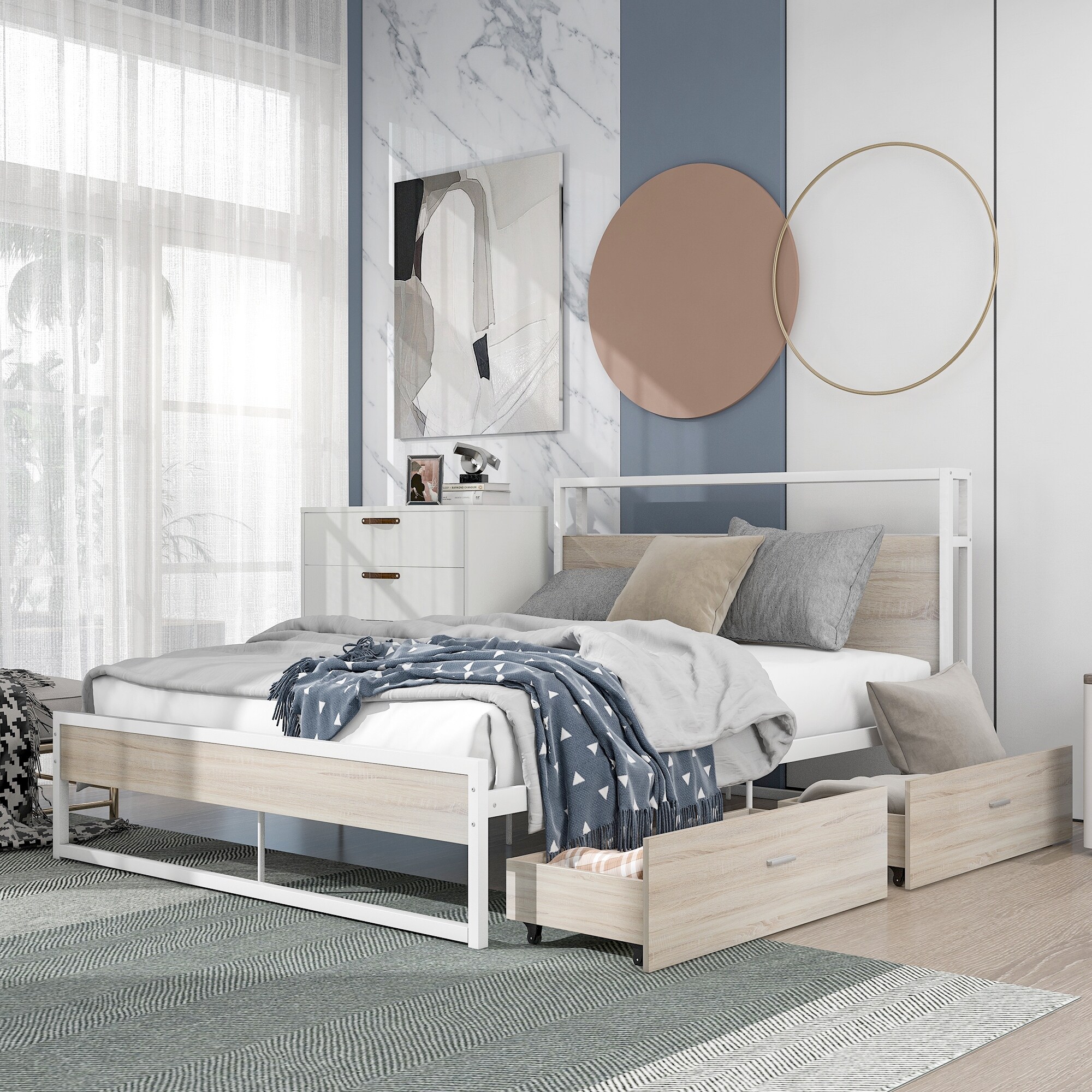 Metal Platform Bed Frame with Wooden Headboard, 2 Storage Drawers, Sockets, and USB Ports