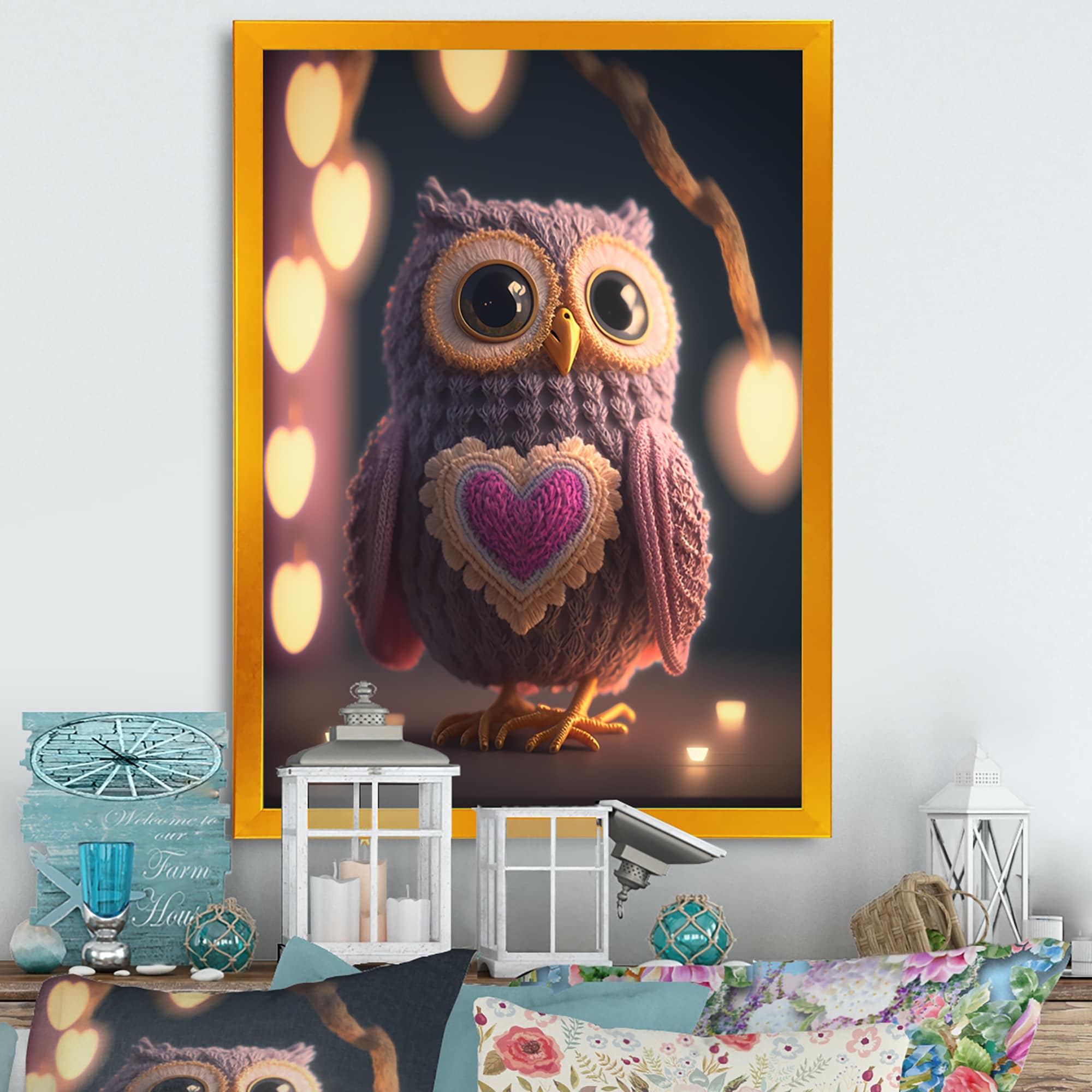 Designart "Cute Knitted Valentine Heart Owl I" Animals Owl Framed Art Print