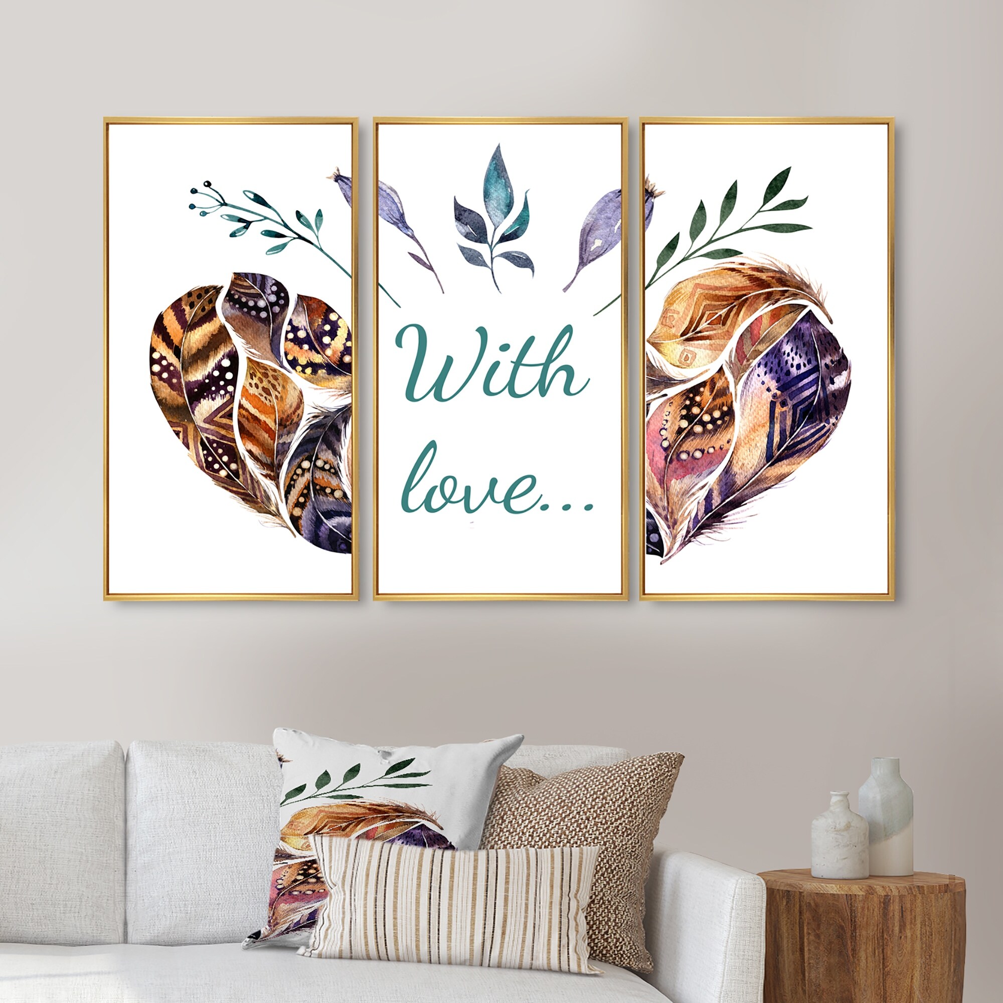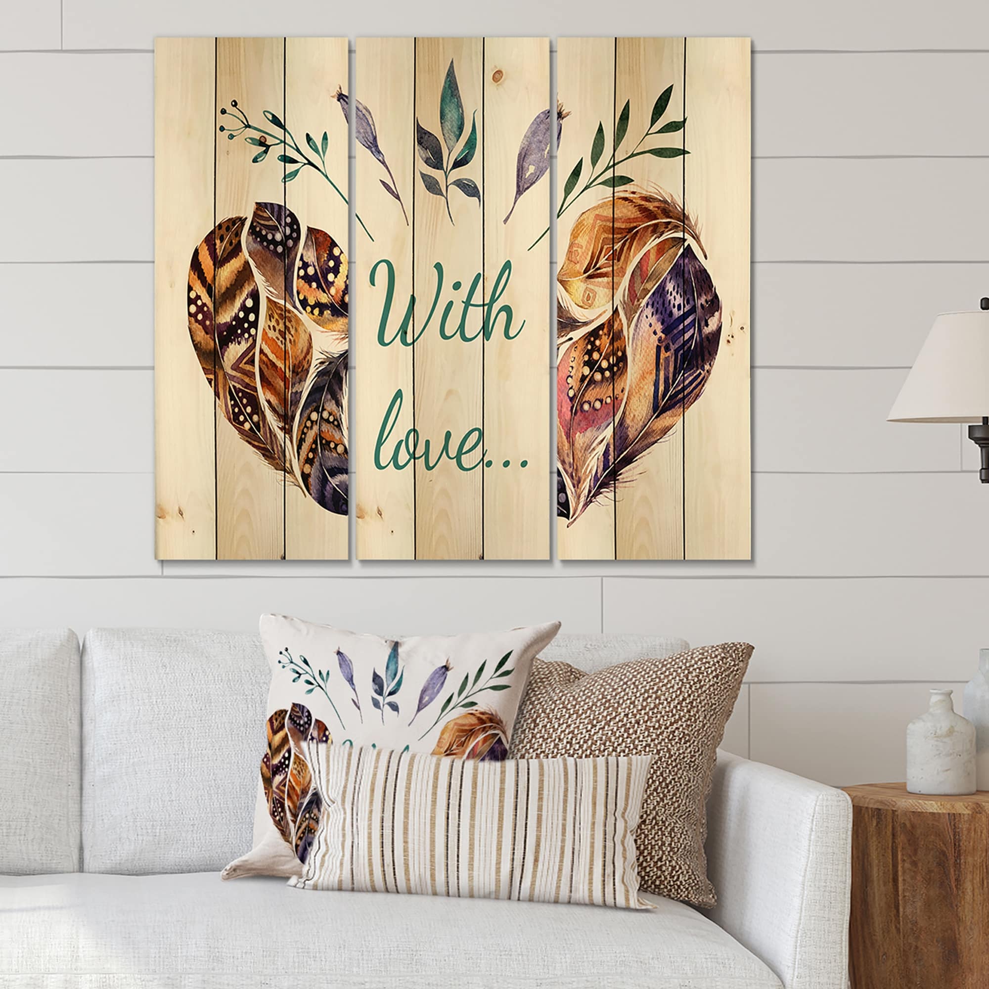 Designart 'Hearted Shaped Valentine Feathers' Traditional Print on Natural Pine Wood - 3 Panels