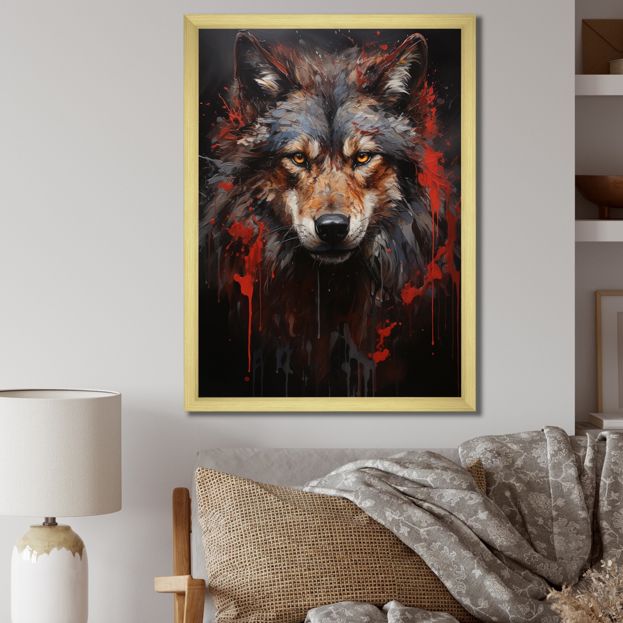 Designart "Crimson Wolf Bold I" Animals Wolf Framed Canvas Print