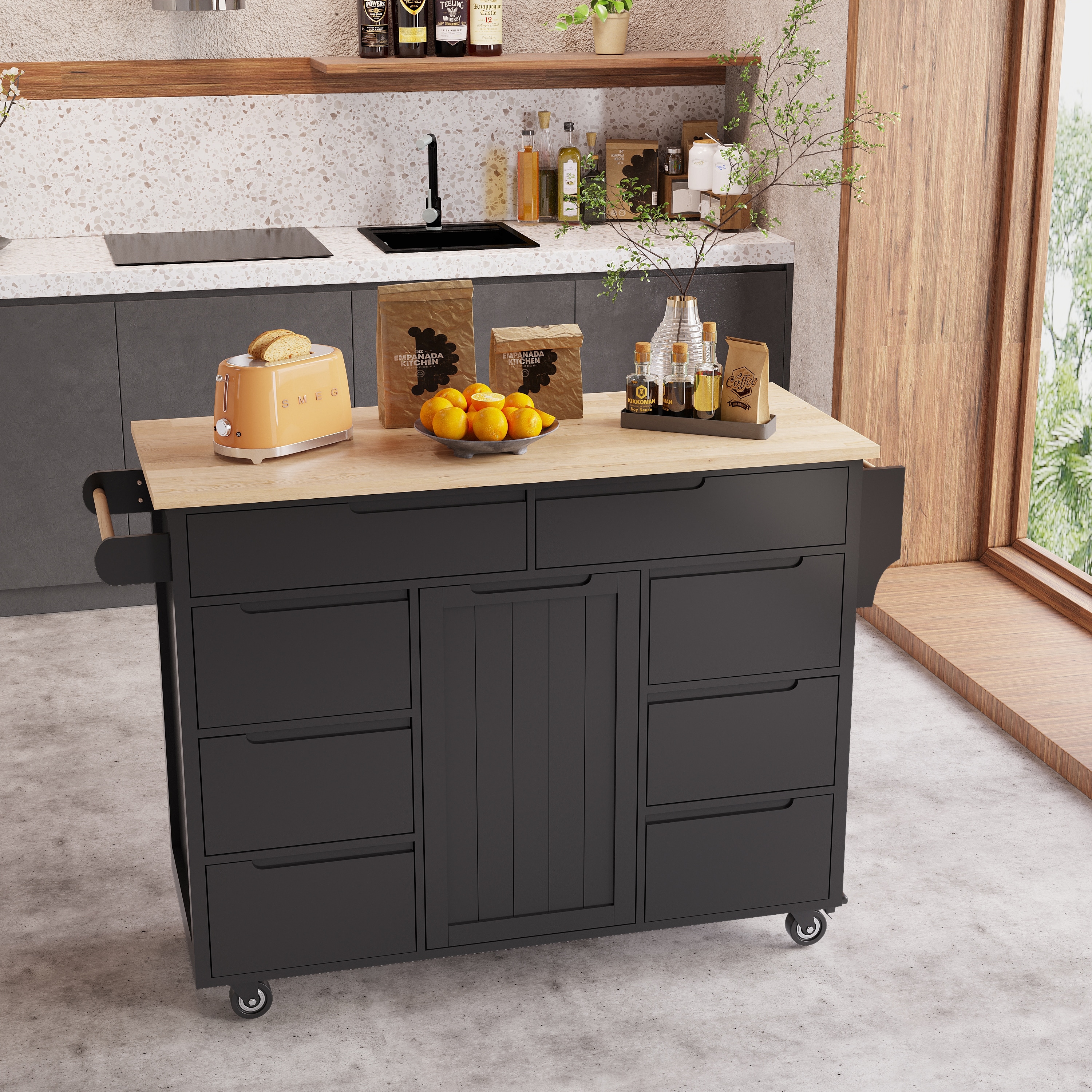 Kitchen Cart with Rubber Wood Countertop , Kitchen Island has 8 Handle-Free Drawers