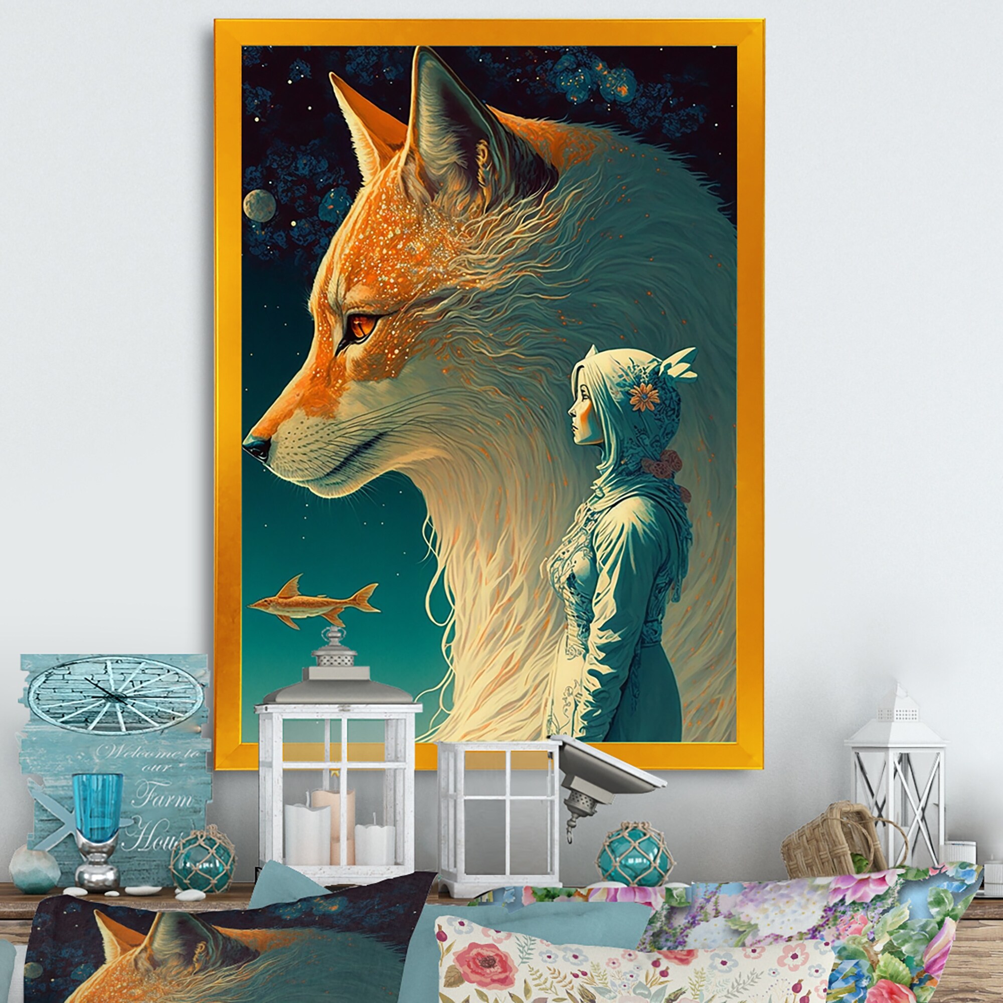 Designart "Cosmic Fox With Young Woman" Animals Fox Framed Art Print