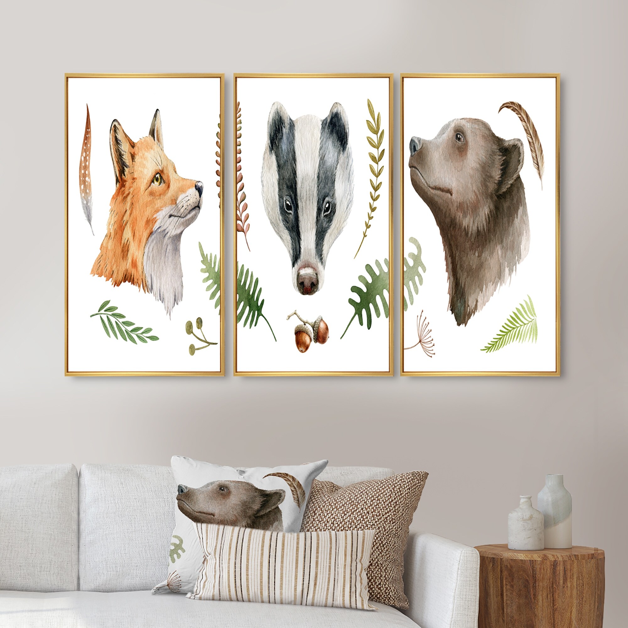 Designart "Fox Bear And Badger" Traditional Framed Wall Decor Set of 3 - 4 Colors of Frames