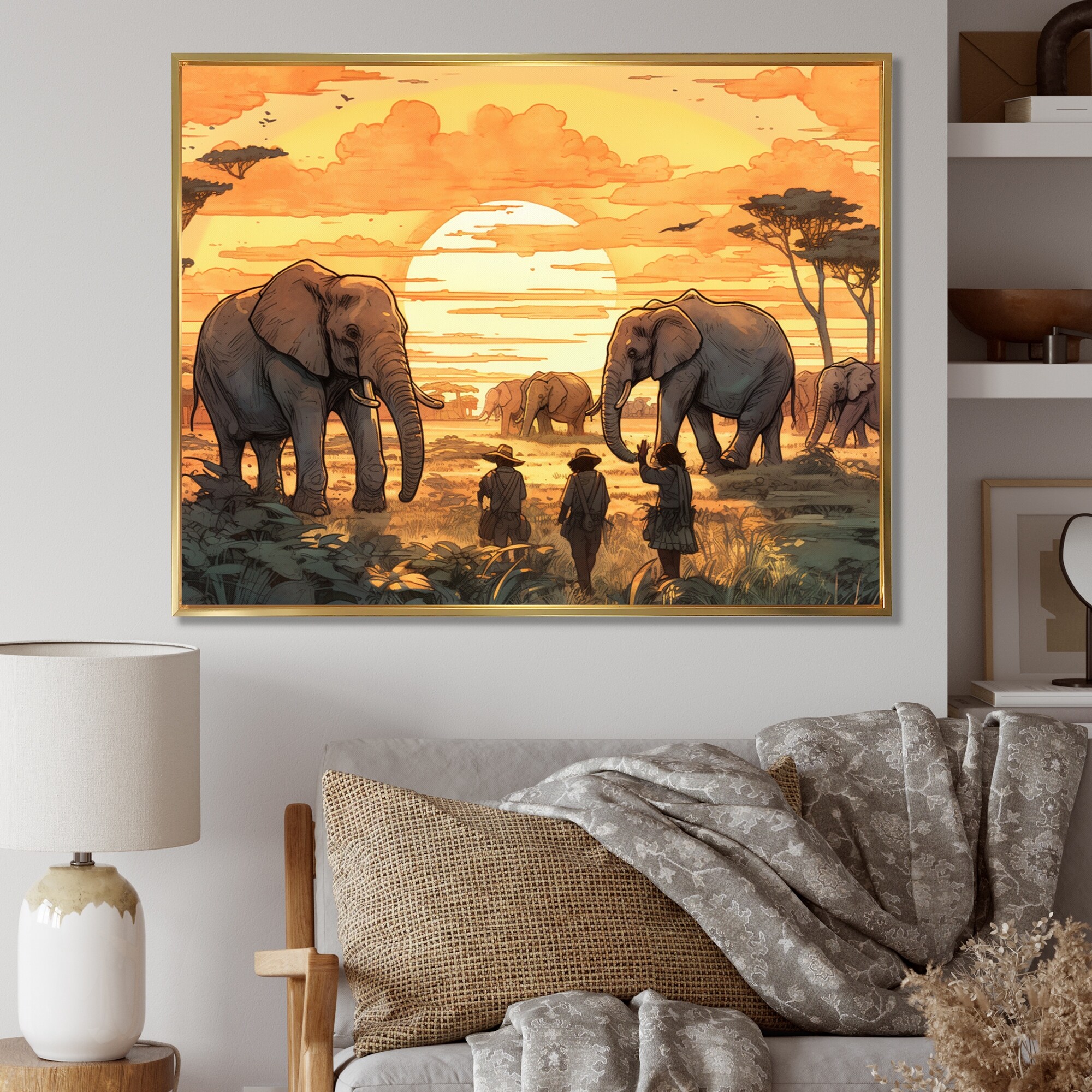 Designart "Yellow African Safari With Elephants" Animals Elephant Framed Canvas Wall Art