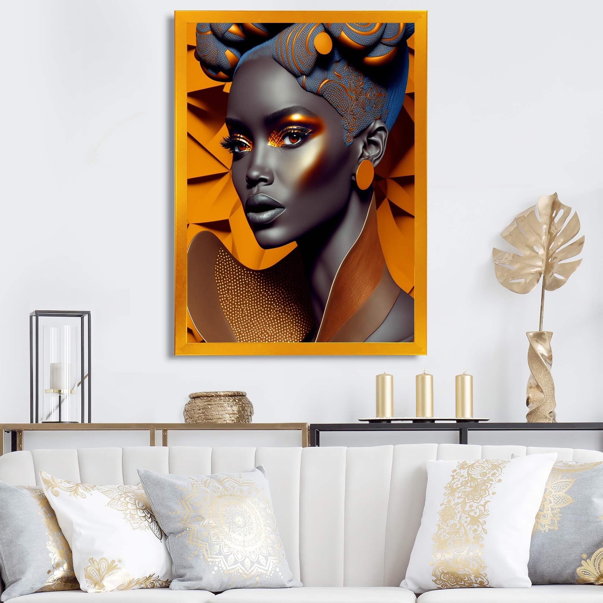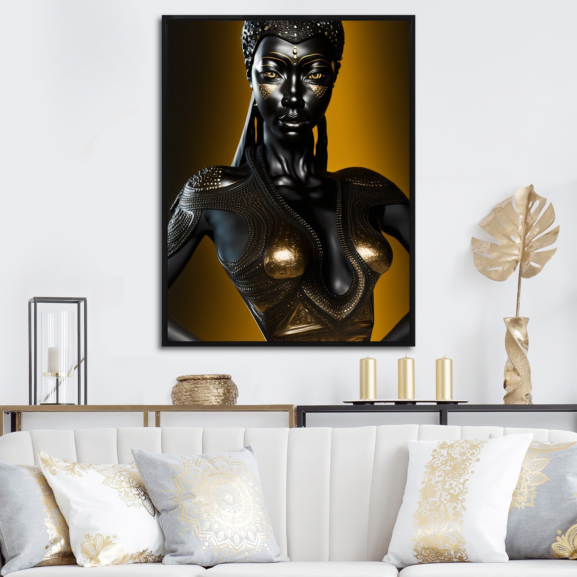 Designart "Close-Up Black And Gold African Goddess VI" African American Woman Framed Canvas Print