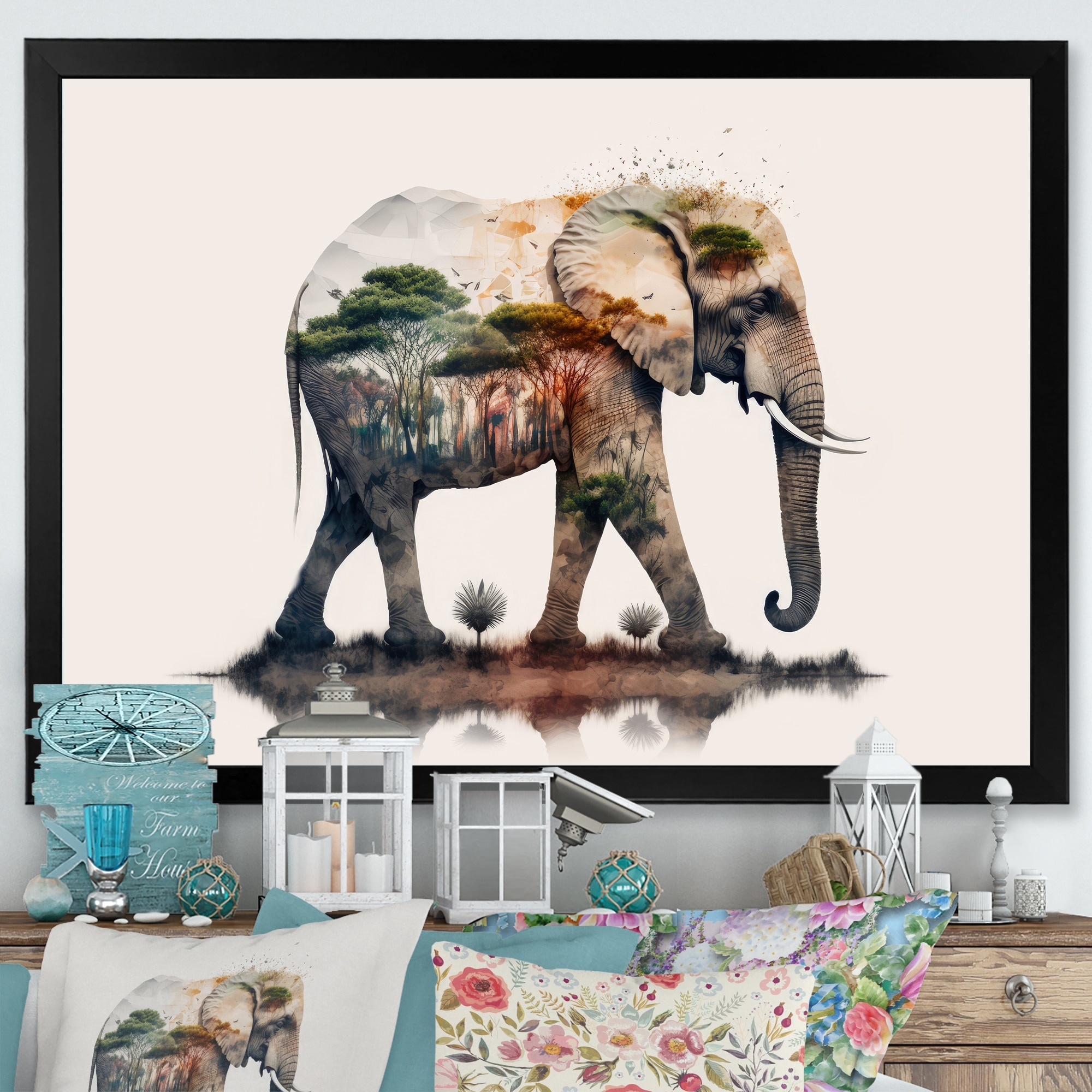 Designart "Double Exposure of a Elefant With African Landscape I" Modern Framed Art Print