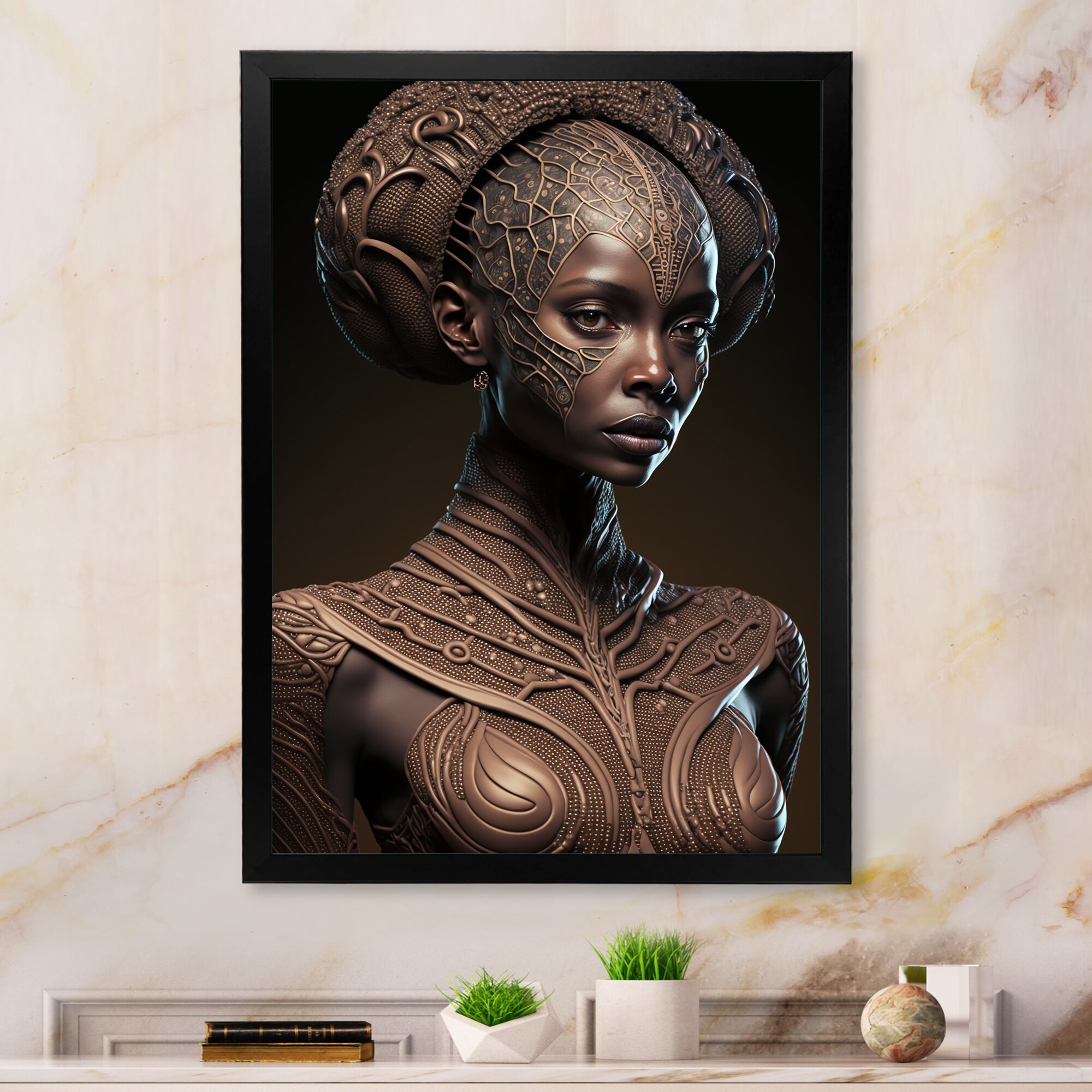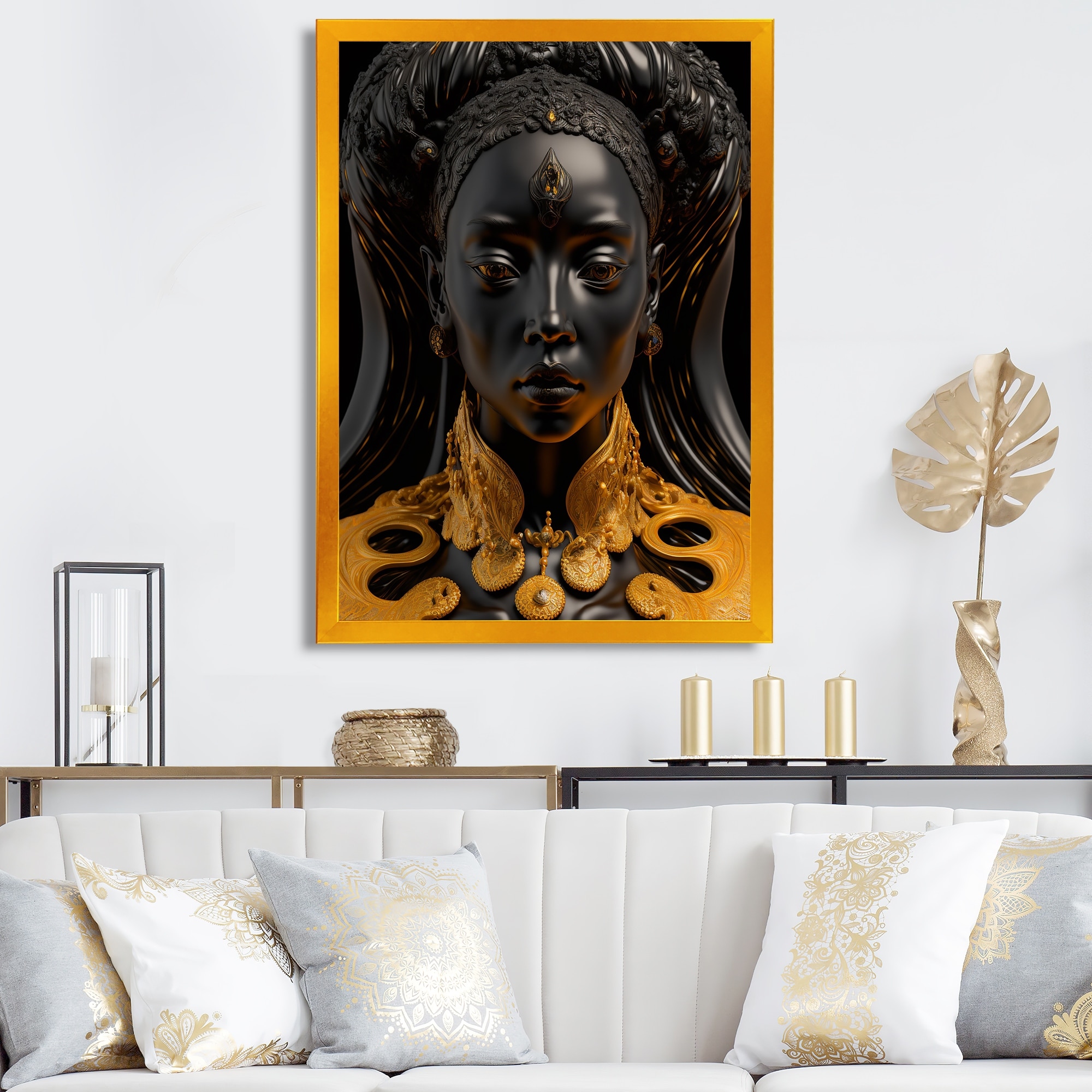 Designart "Porcelain Portrait of Black And Gold African Goddess I" African American Woman Framed Wall Art Prints