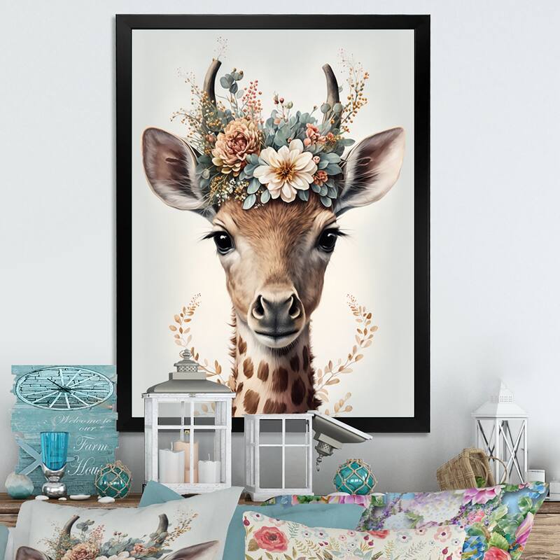Designart "Cute Baby Giraffe With Floral Crown I" Animals Framed Art Print