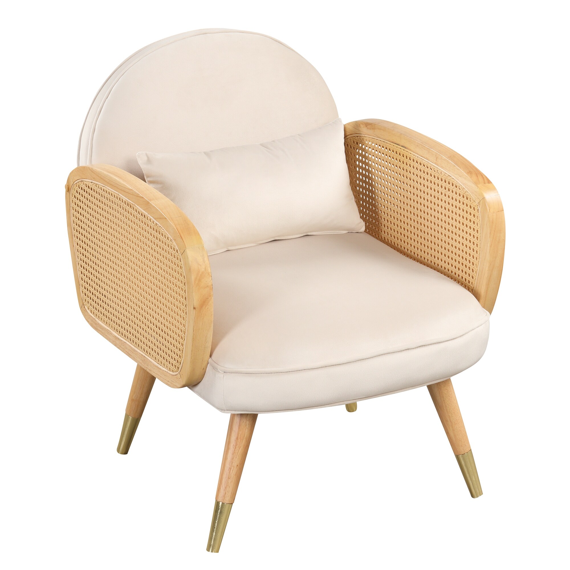 Amchair with Rattan Armrest and Metal Legs Upholstered Mid Century Modern Chairs for Living Room or Reading Room, White