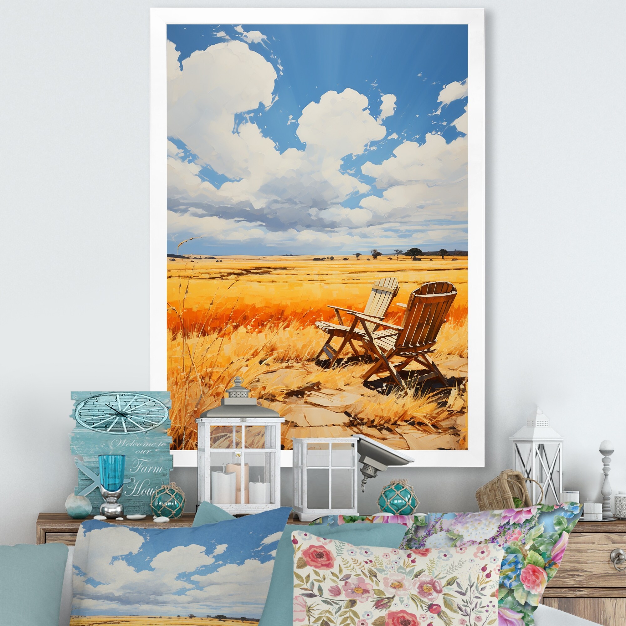 Designart "Yellow Blue Bold Sky And Golden Prairies V" Prairies Framed Canvas Wall Art