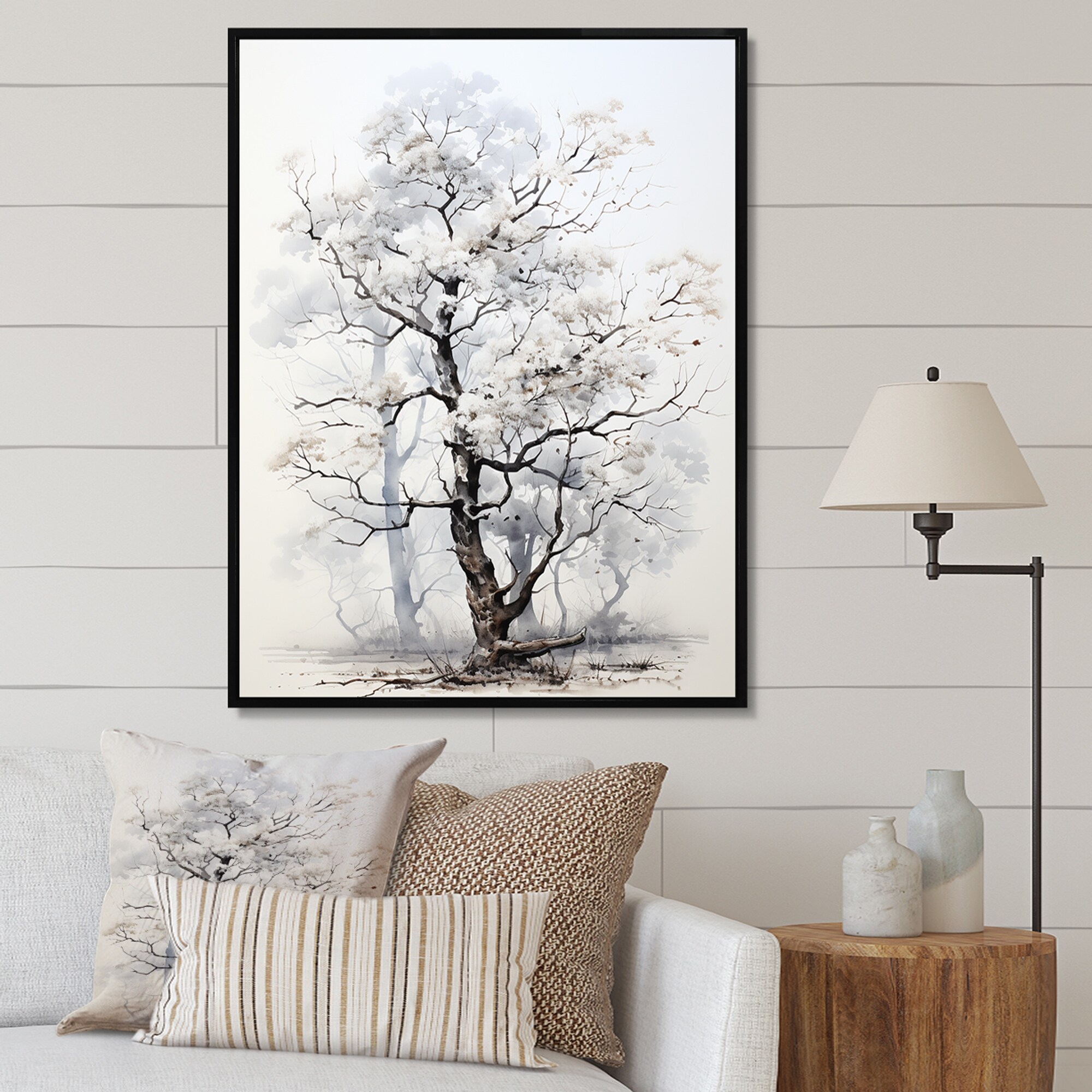 Designart "White Tree Mystique Landscape" Tree Monochrome Framed Canvas Wall Art