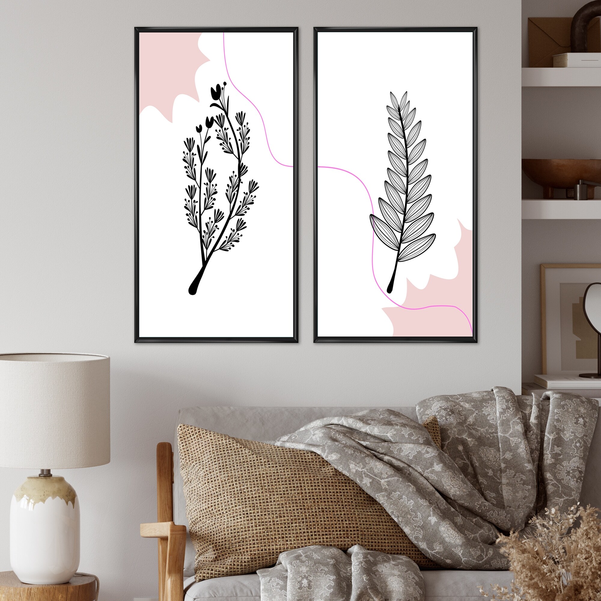 Designart "Botanical Flower Silhouette on Retro Colors V" Abstract Framed Art Set of 2 Pieces