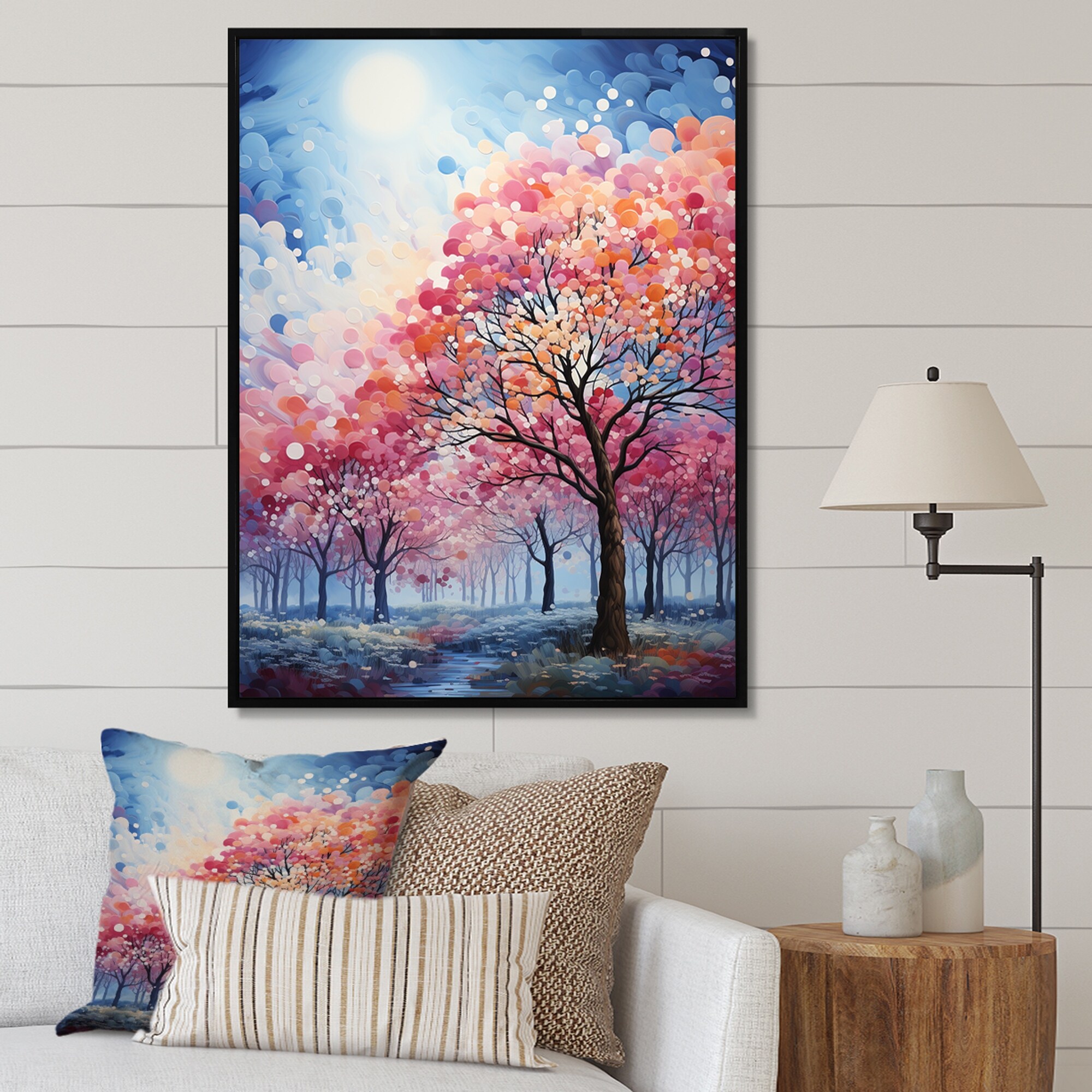 Designart "Pink And Blue Trees Field Pointillism I" Landscape Trees Framed Canvas Wall Art