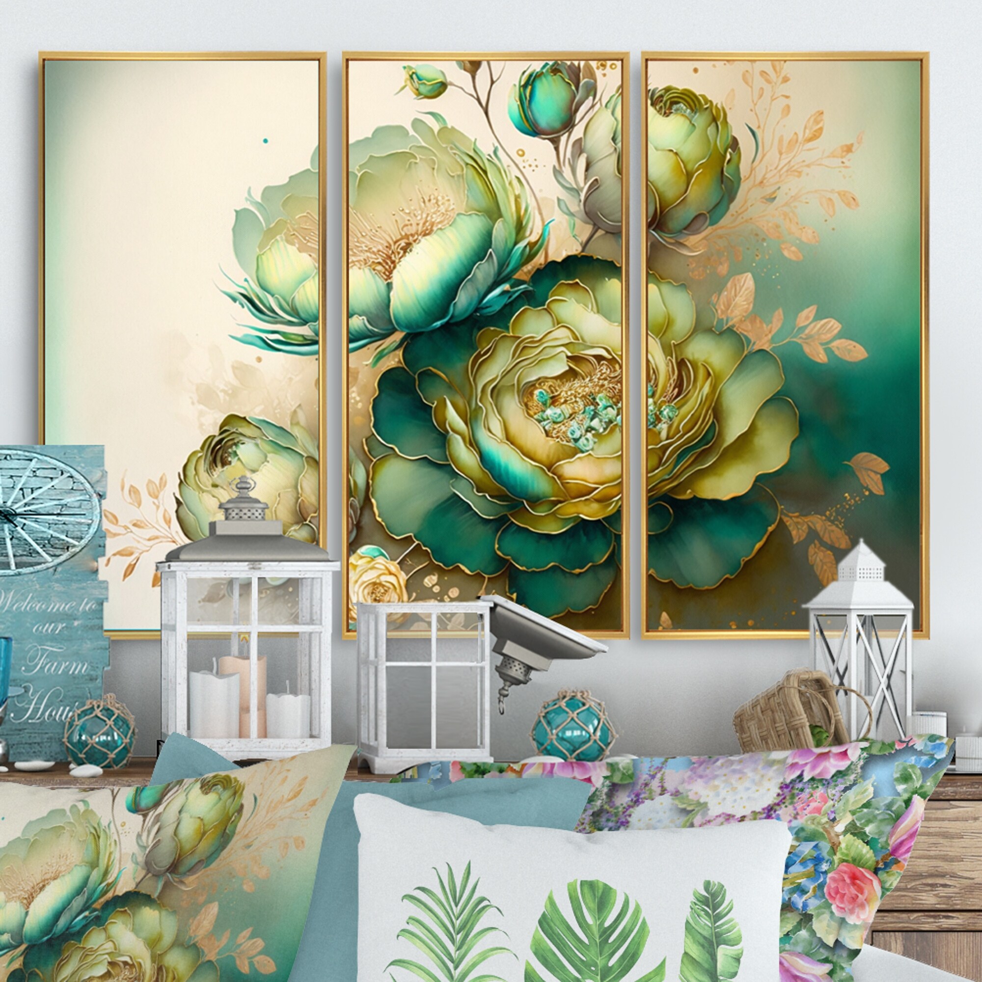 Designart "Green Blooming Rose " Floral Rose Framed Canvas Art Print - 3 Panels