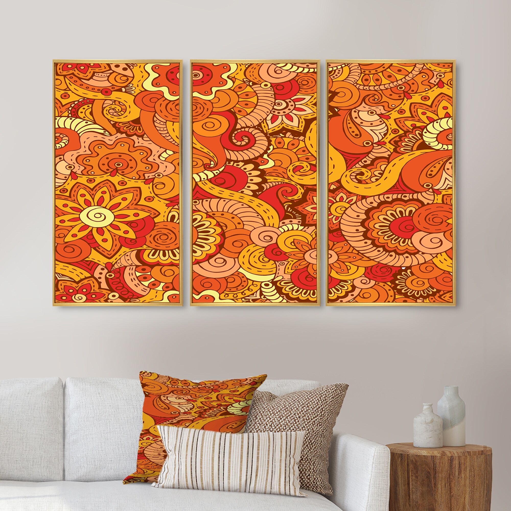 Designart "Retro Orange Asian Waves" Bohemian Framed Wall Art Set of 3 - 4 Colors of Frames