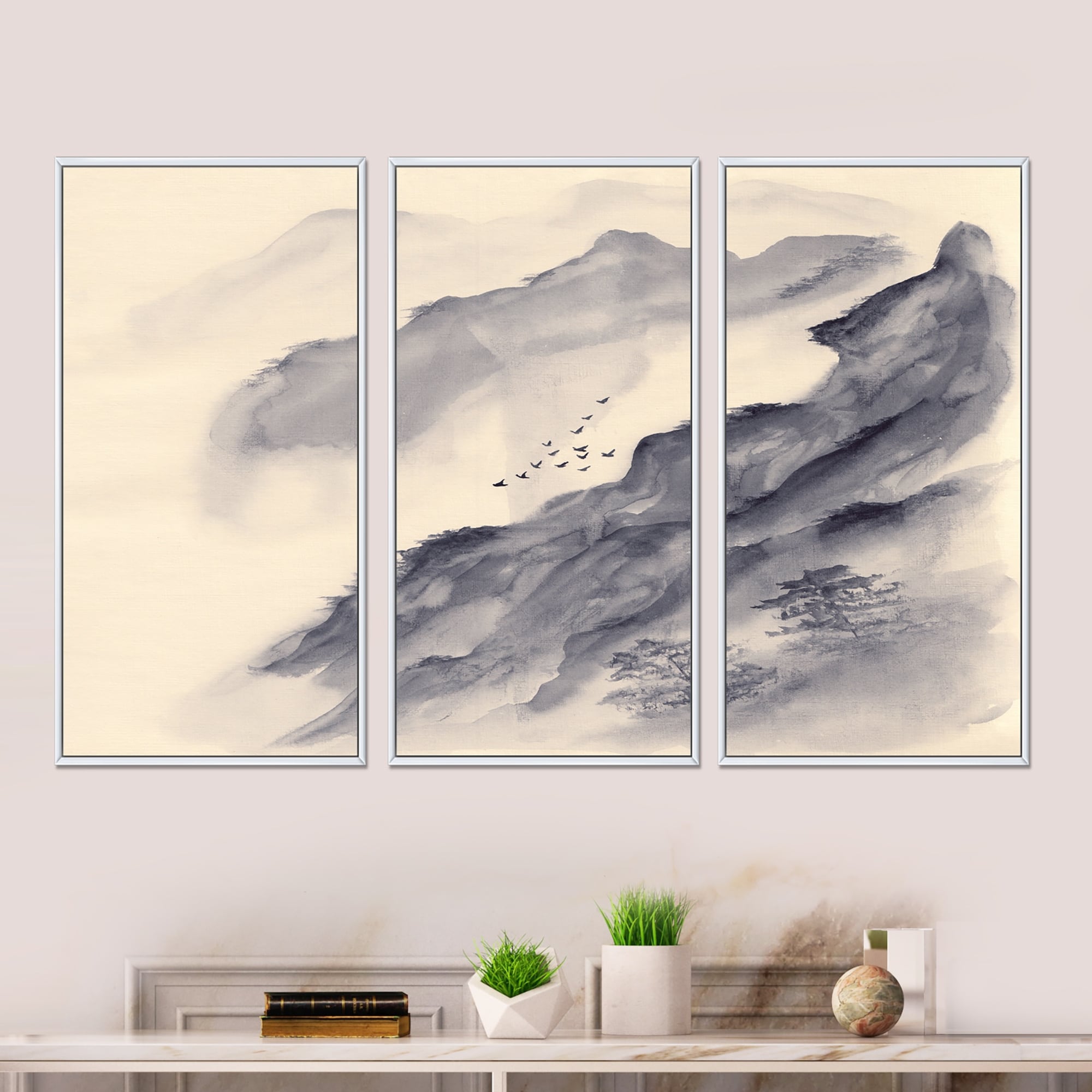 Designart "Grey Asian Mountains With Birds" Modern Framed Wall Art Set of 3 - 4 Colors of Frames