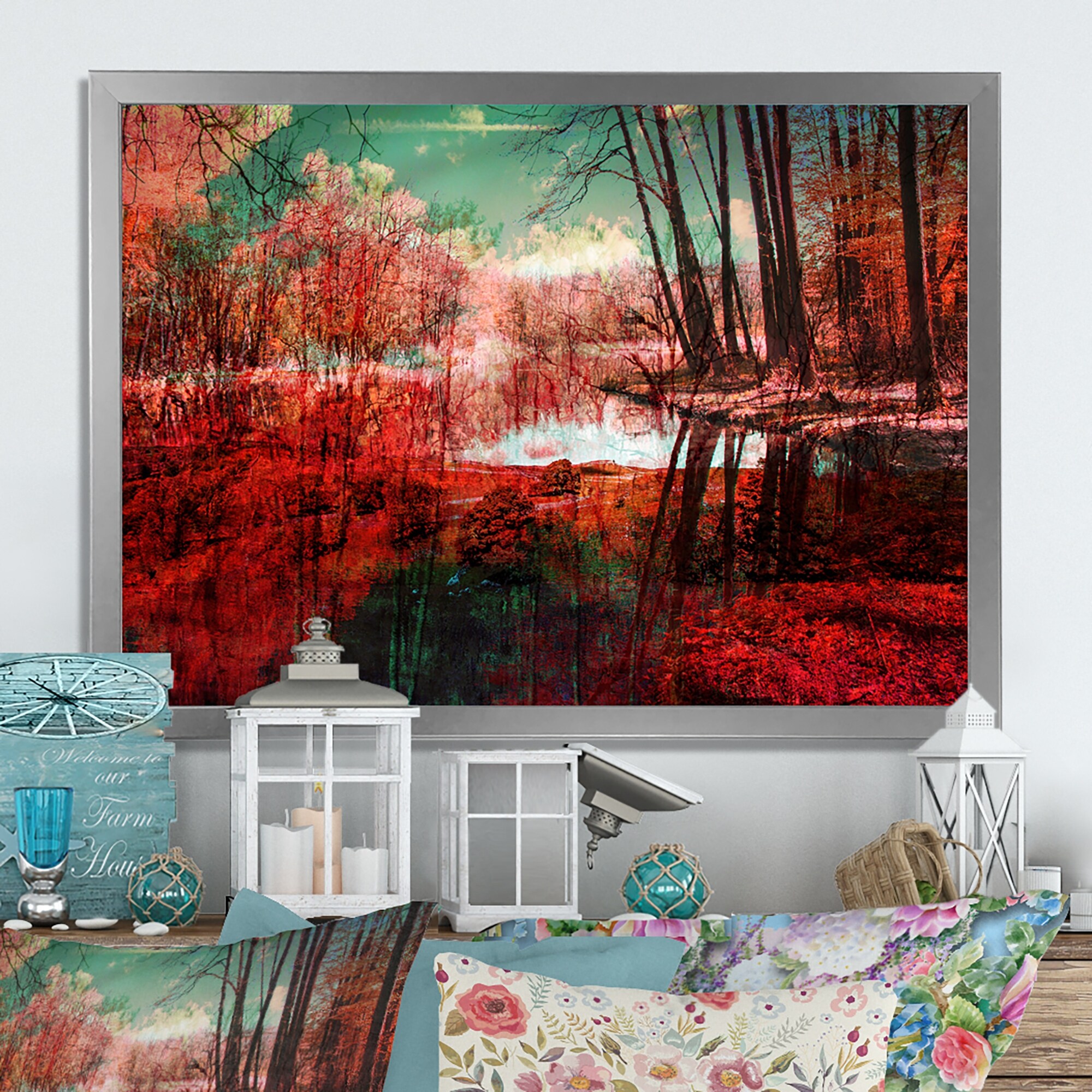 Designart "Red Autumn Artistic Forest By the Lake" Traditional Framed Wall Art