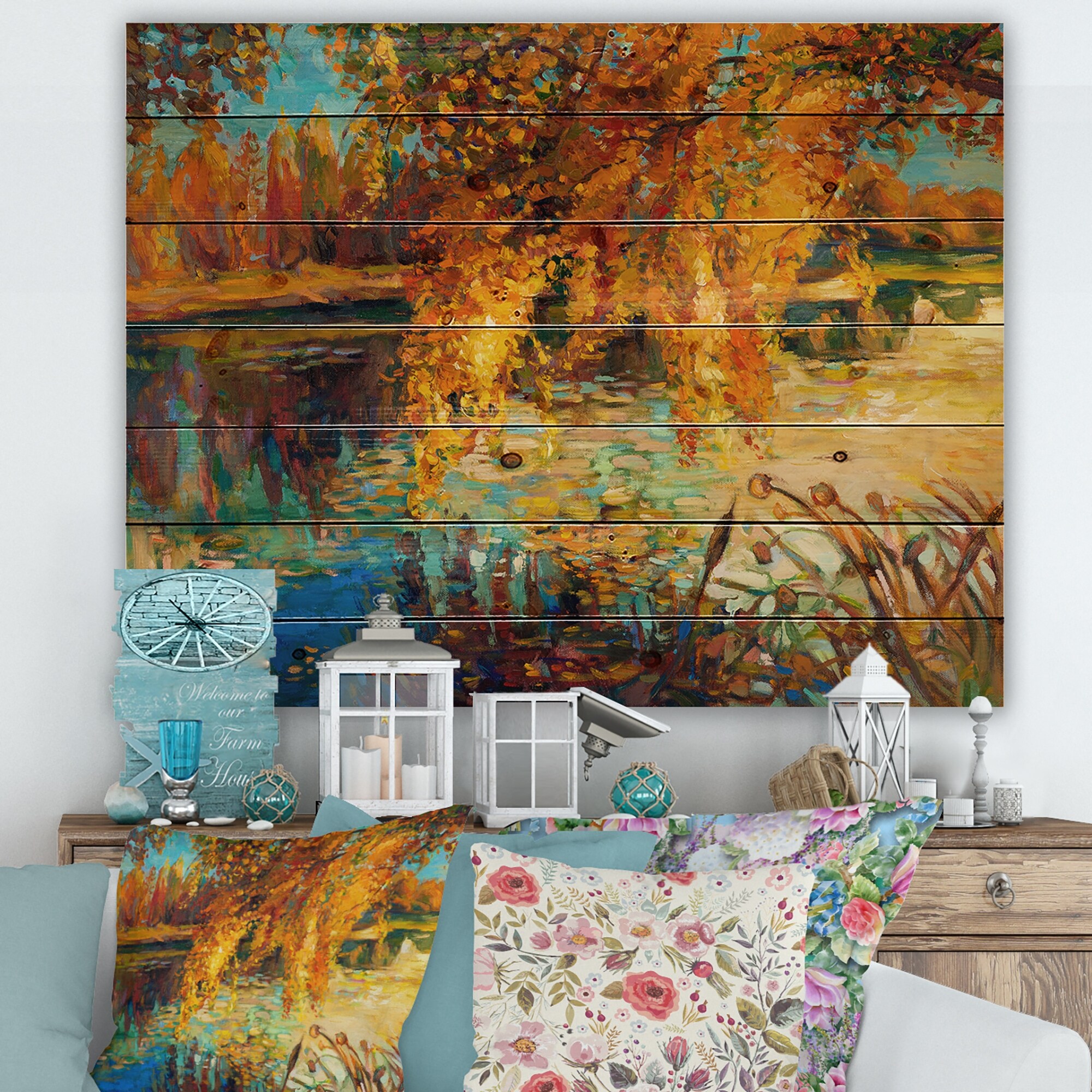 Designart 'Orange Autumn Forest' Lake House Print on Natural Pine Wood