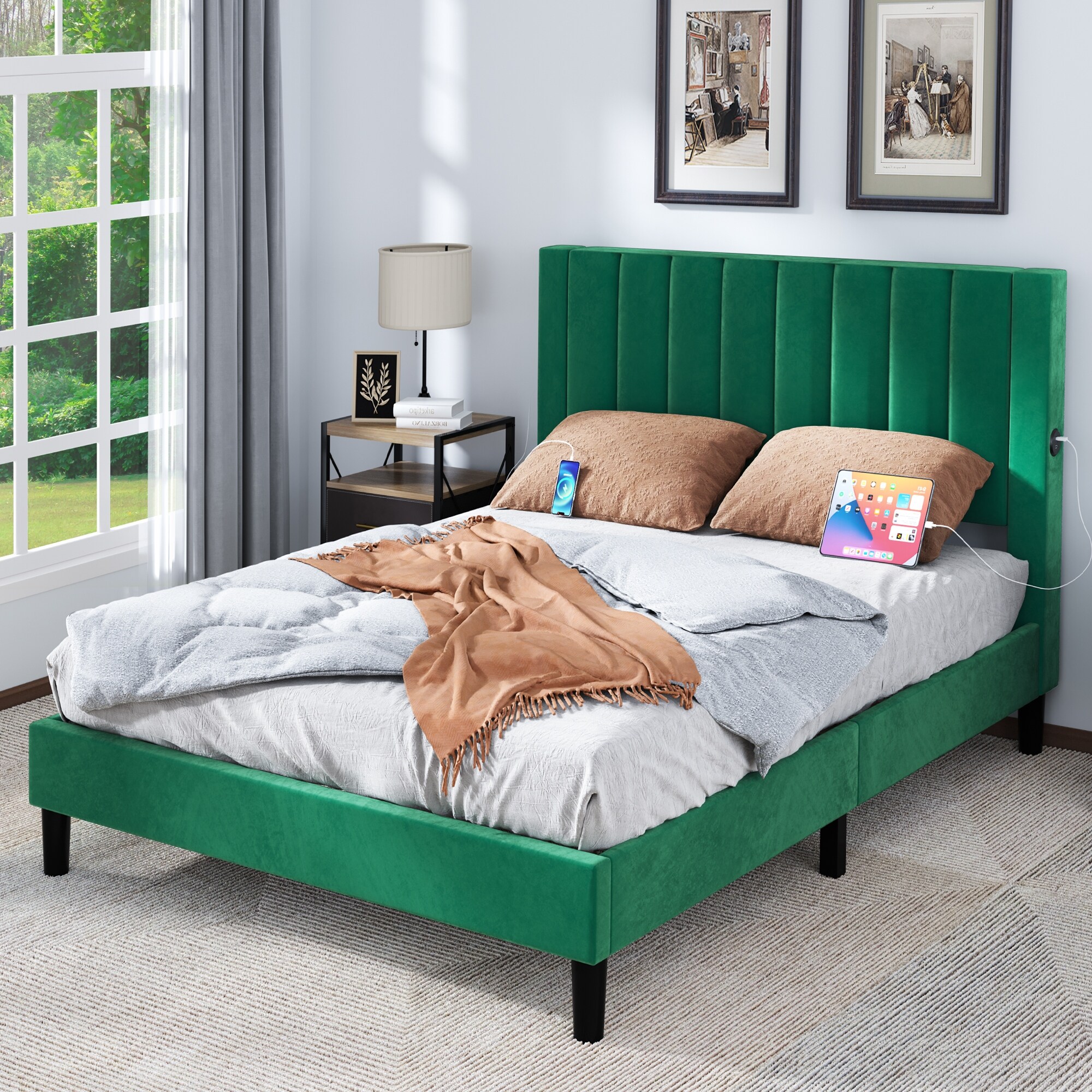 Green/Grey Velvet Upholstered Headboard Platform Bed Frame