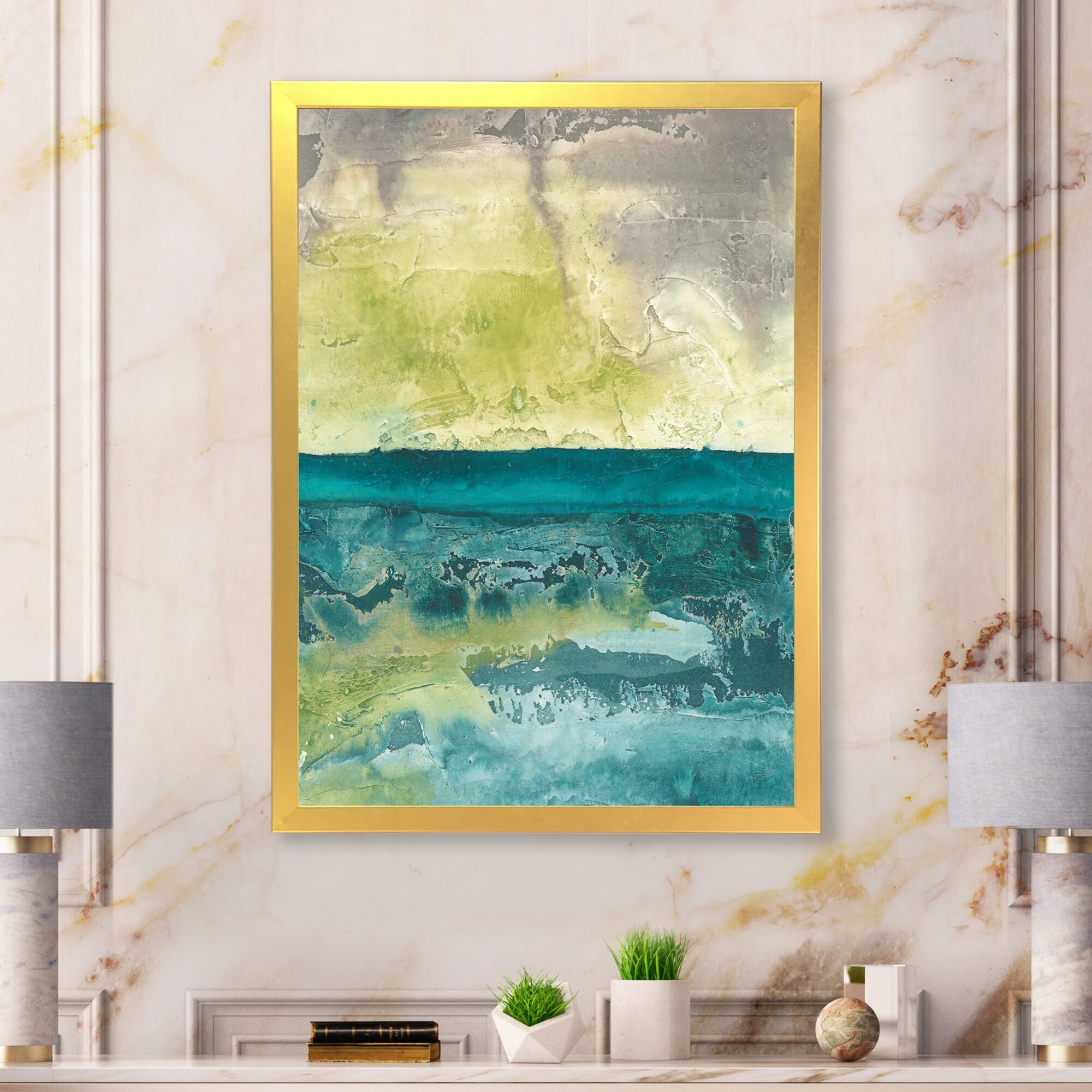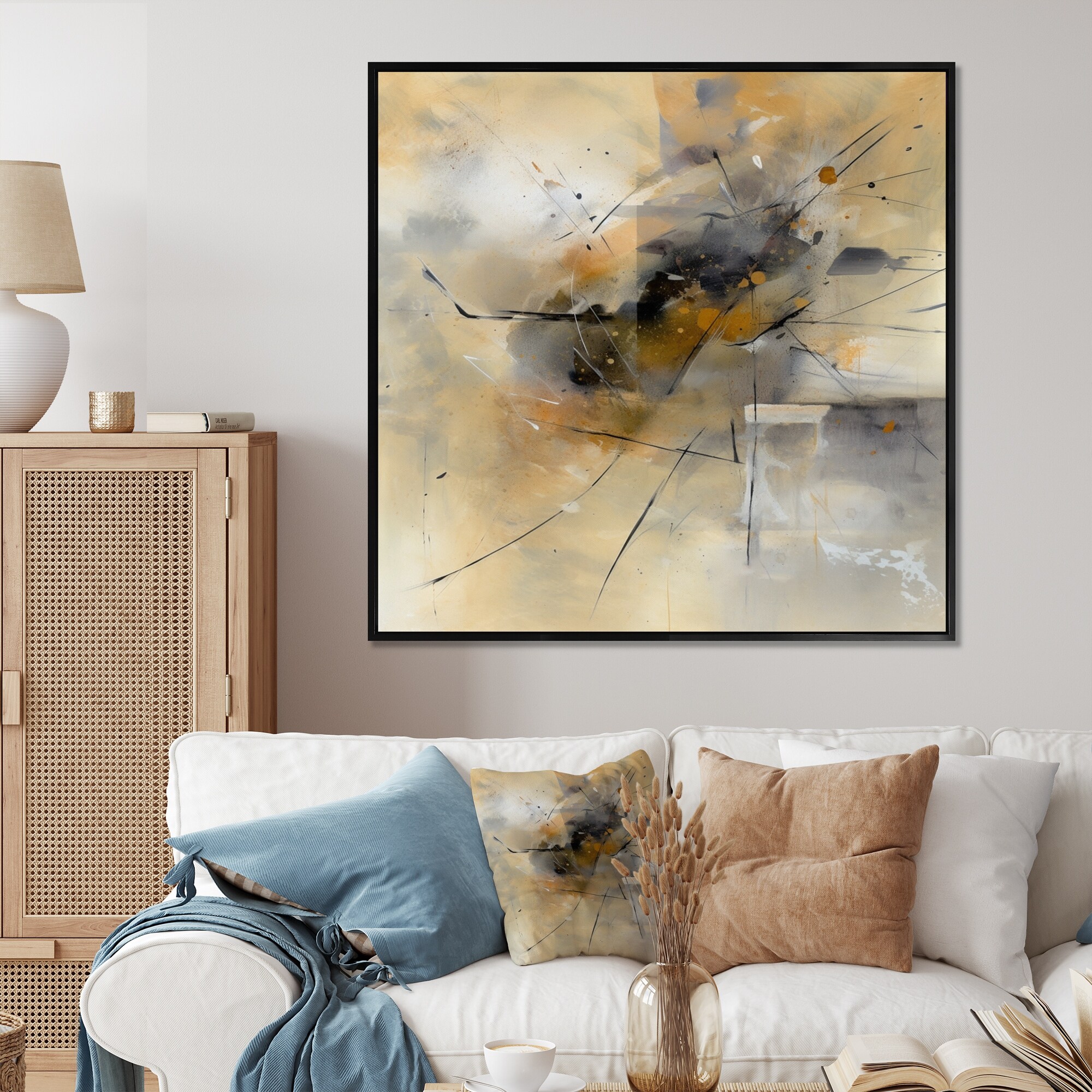 Designart "Yellow And Grey Beyond the Canvas V" Abstract Painting Framed Canvas Wall Art