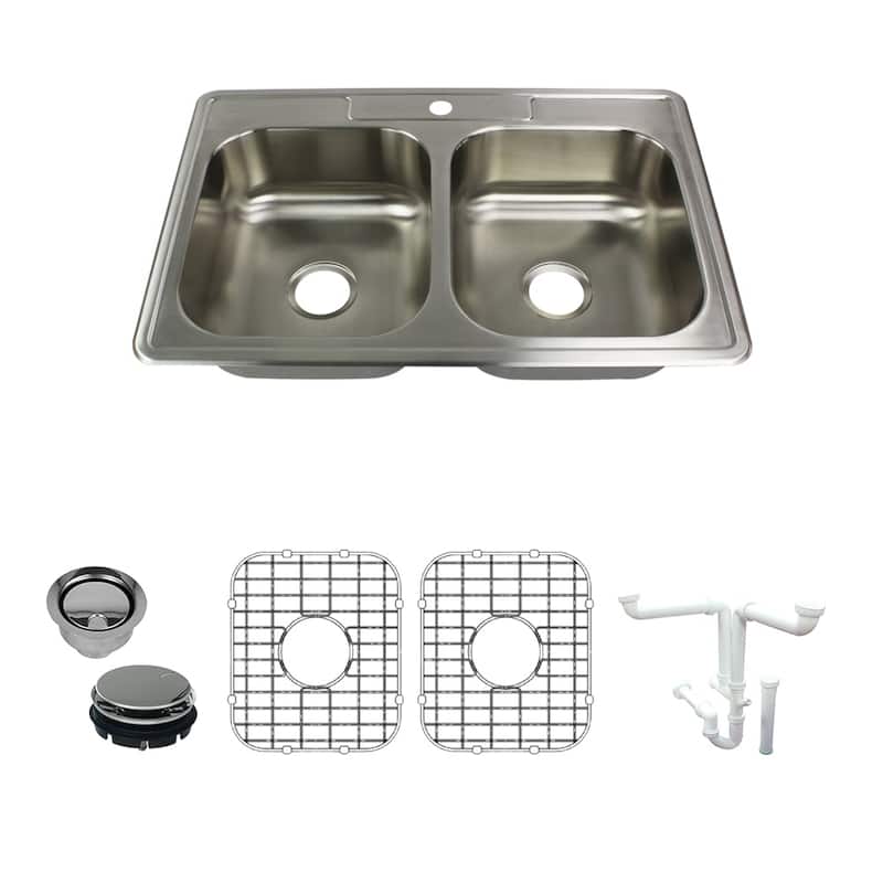 Transolid Select 33-in 20 Gauge Drop-in Double Bowl Kitchen Sink with Grids, Strainer, Disposer Strainer, Inst