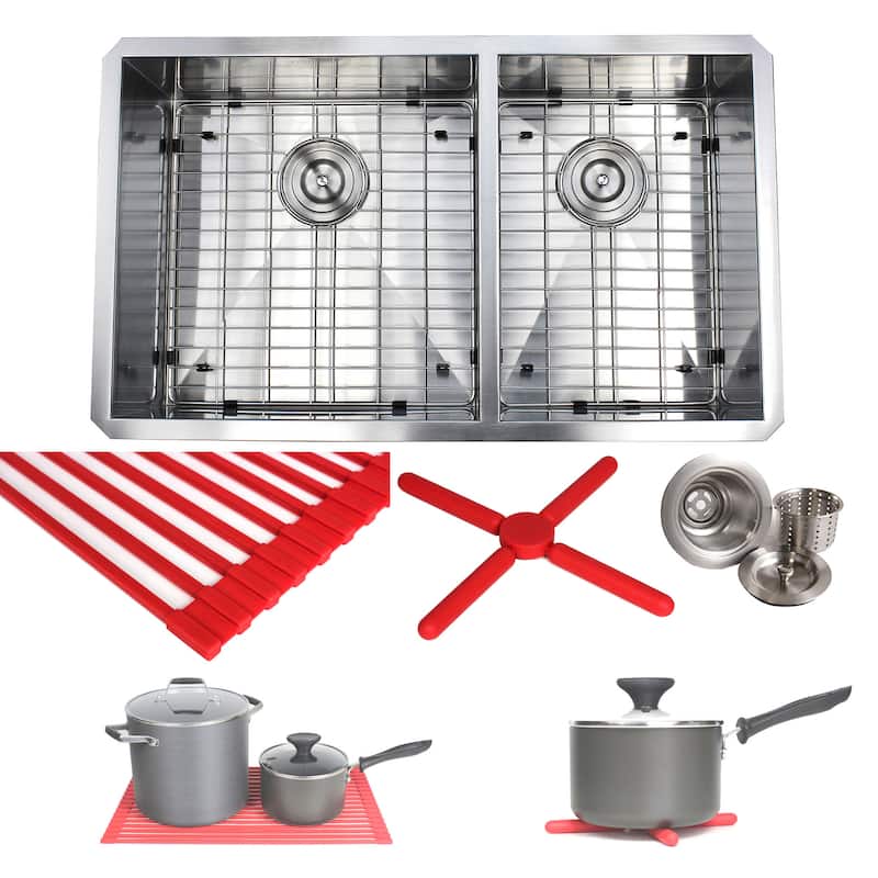 32-inch Stainless Steel Double Bowl 60/40 Zero Radius 16 Gauge Undermount Kitchen Sink Complete Combo Accessories