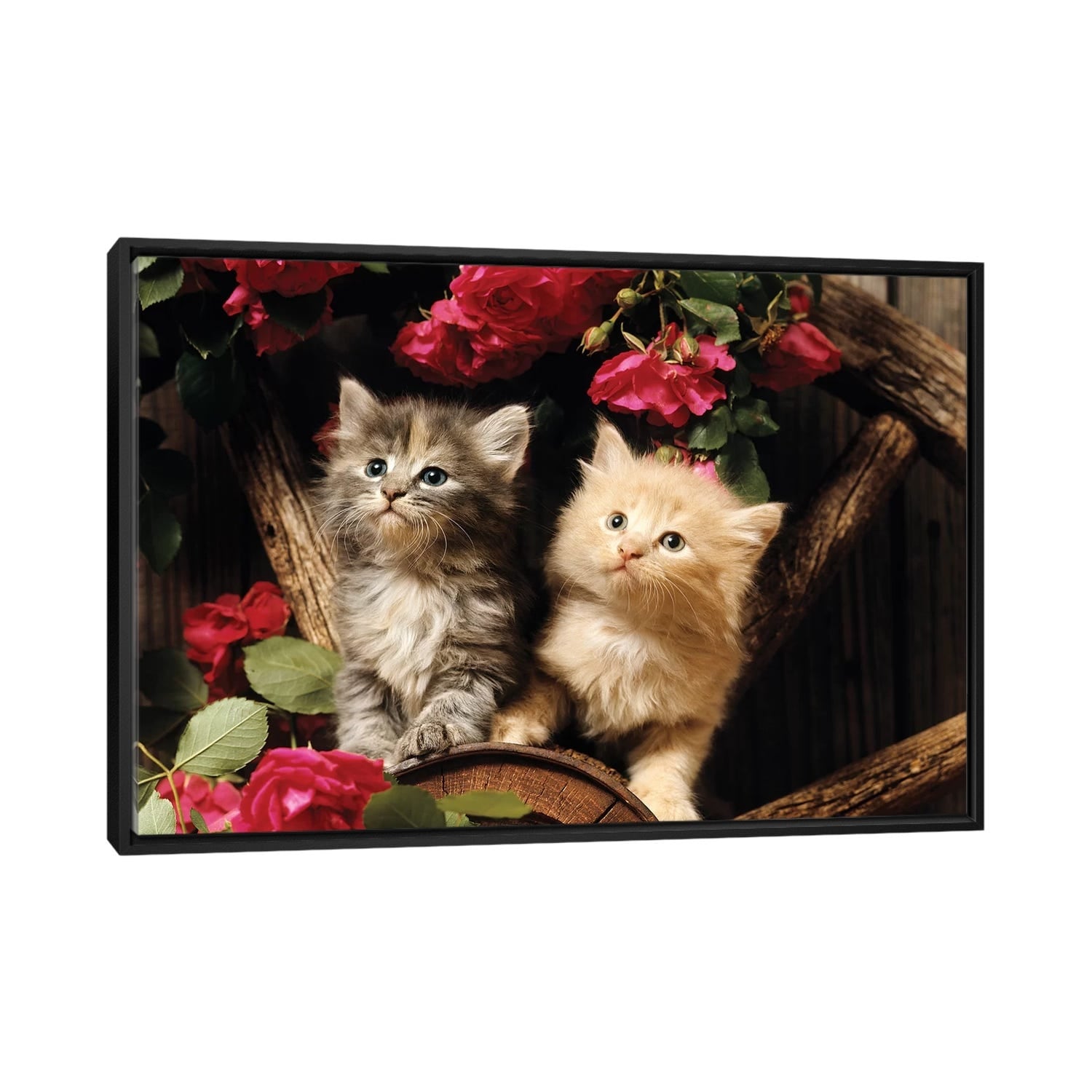 iCanvas "1980s Two Kittens Climbing on Wagon Wheel Amid Wild Red Roses" by Vintage Images Framed