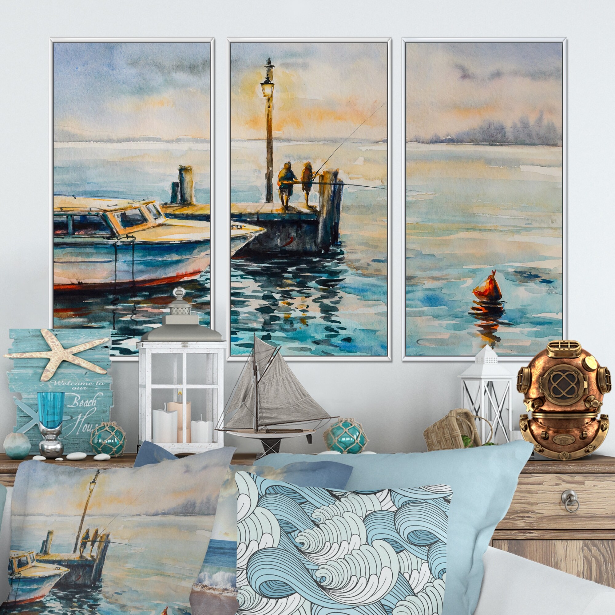 Designart "Two Men Fishing At Dusk At the Pier" Nautical & Coastal Framed Wall Art Set of 3 - 4 Colors of Frames