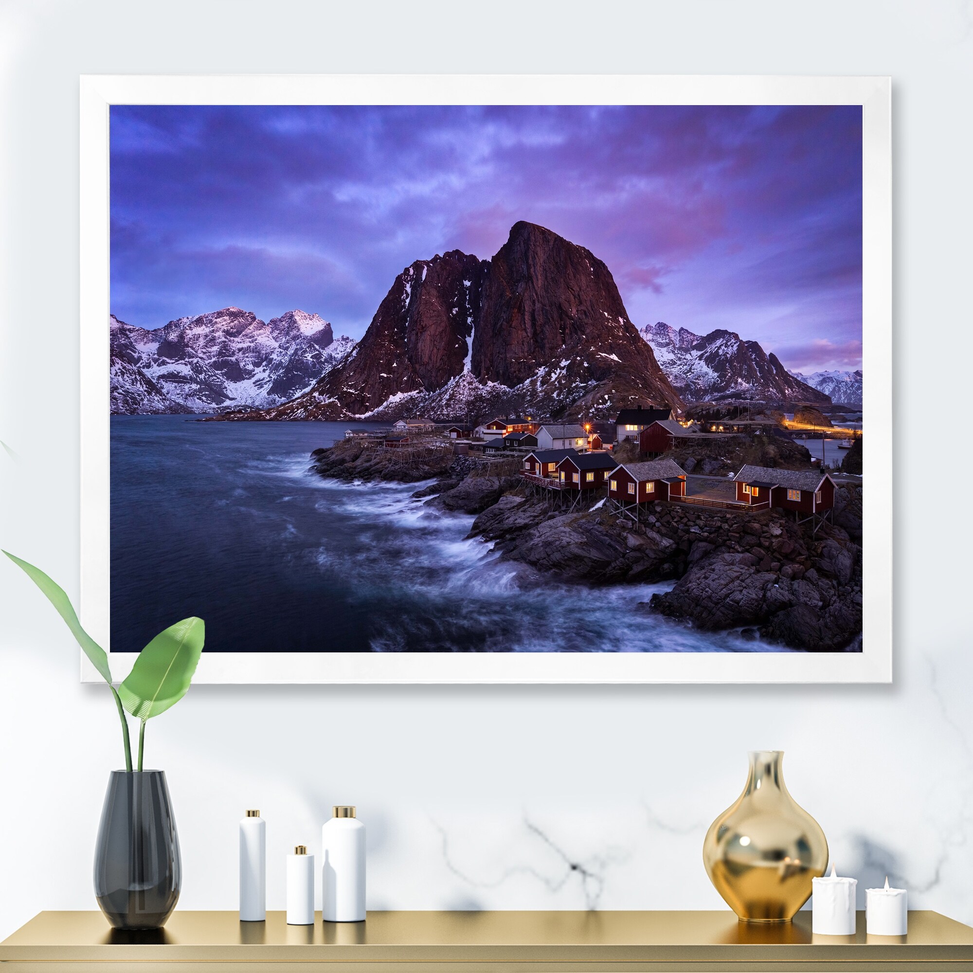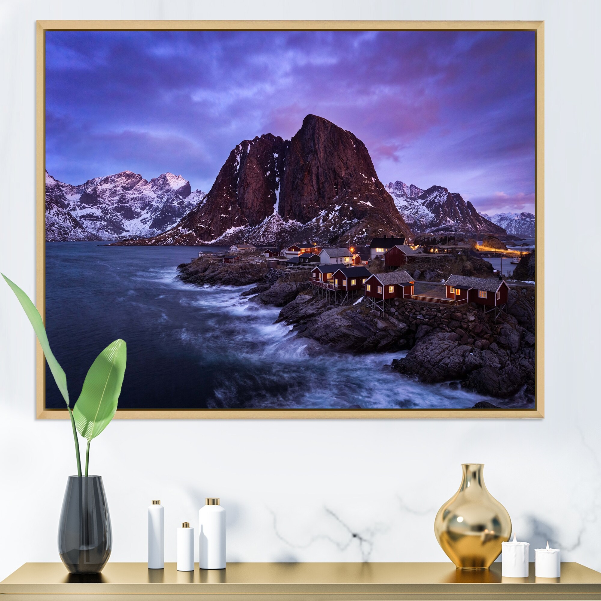 Designart "Fishing Village With Houses in Homnoya At Dusk" Nautical & Coastal Framed Canvas Wall Art Print
