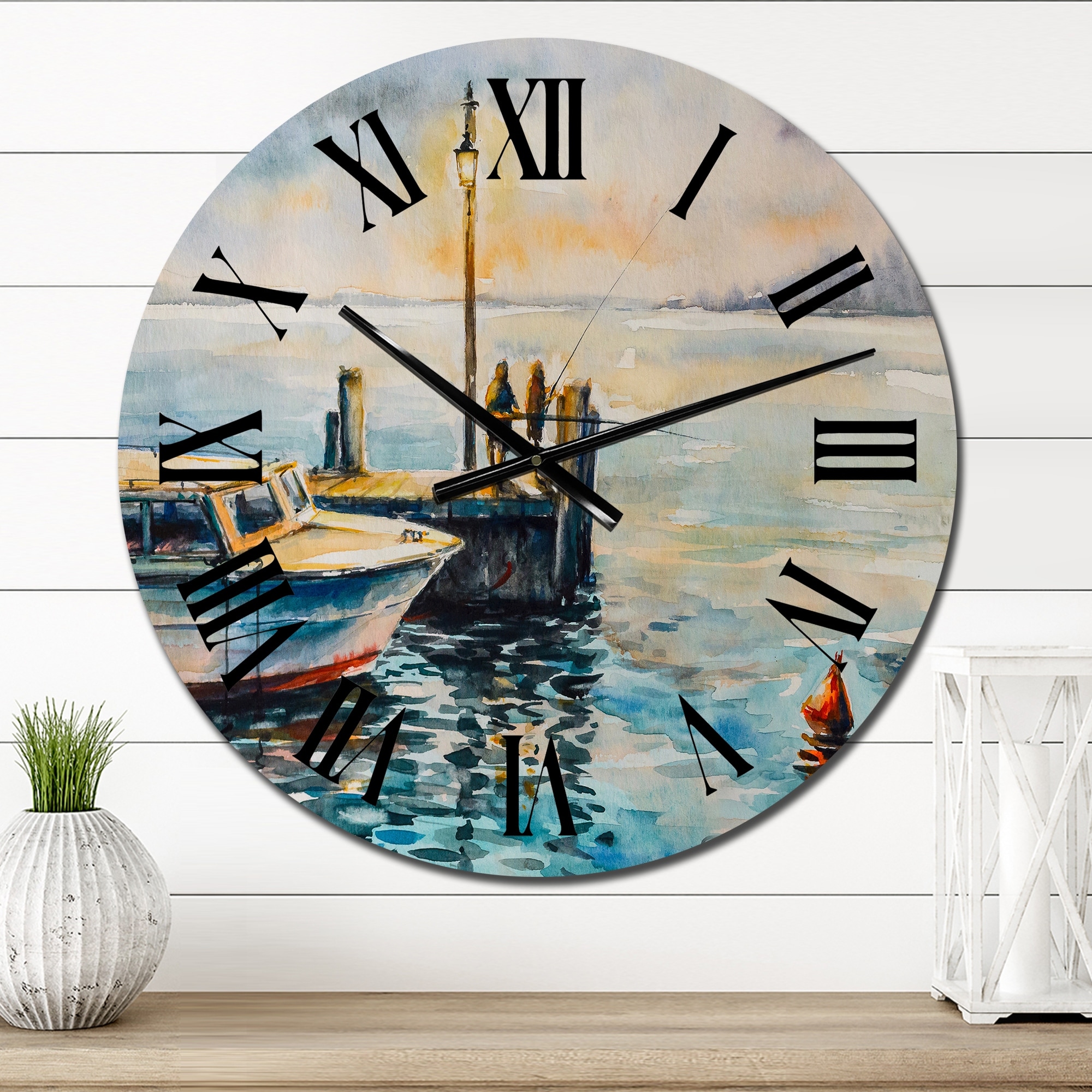 Designart 'Two Men Fishing At Dusk At the Pier' Nautical & Coastal wall clock